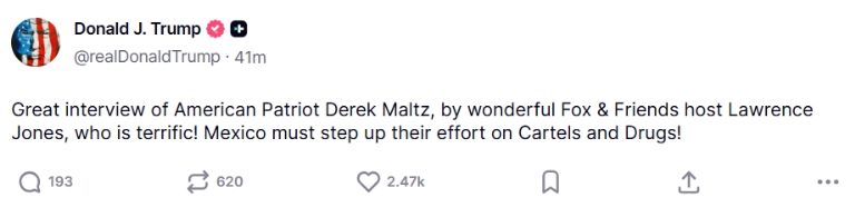 El mandatario recordó que tras la operación en Tapalpa, Jalisco, se registraron bloqueos carreteros, quema de negocios y autobuses en varios estados, comparando la violencia con zonas controladas por Al-Qaeda. “¡México debe intensificar sus esfuerzos contra los cárteles y las drogas!”, escribió, en un mensaje que buscó presionar al gobierno mexicano para redoblar acciones.