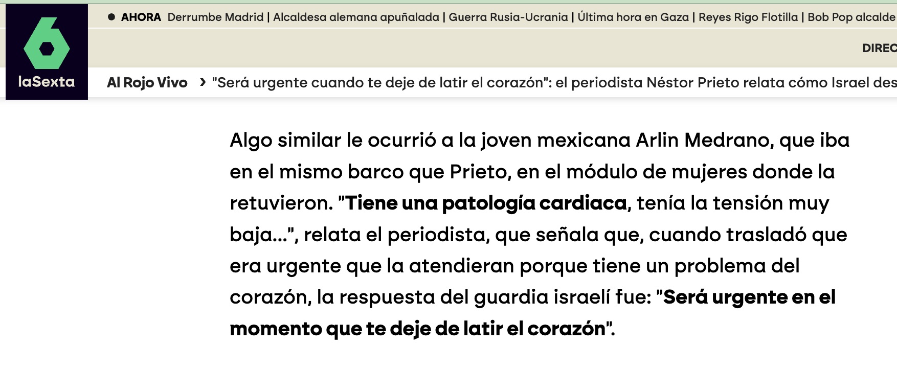El periodista español Néstor Prieto, uno de los activistas ya repatriados, relató que Medrano se encontraba en el módulo de mujeres del barco cuando solicitó con urgencia su medicamento para el corazón. “Tenía la tensión muy baja, y cuando traduje a un guardia israelí que era urgente atenderla, respondió: ‘Será urgente en el momento que te deje de latir el corazón’”, denunció Prieto en nota publicada por lasexta de España.