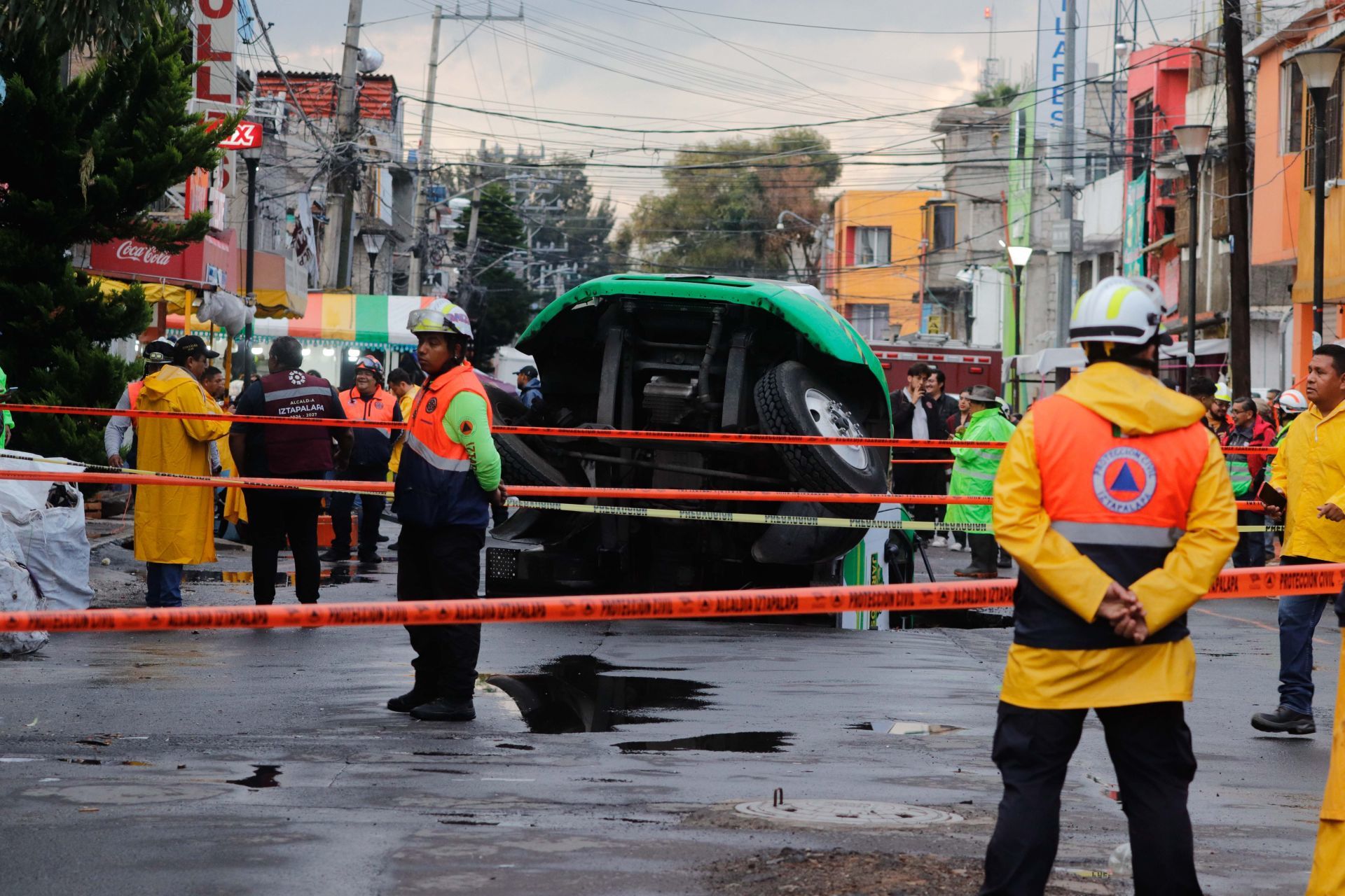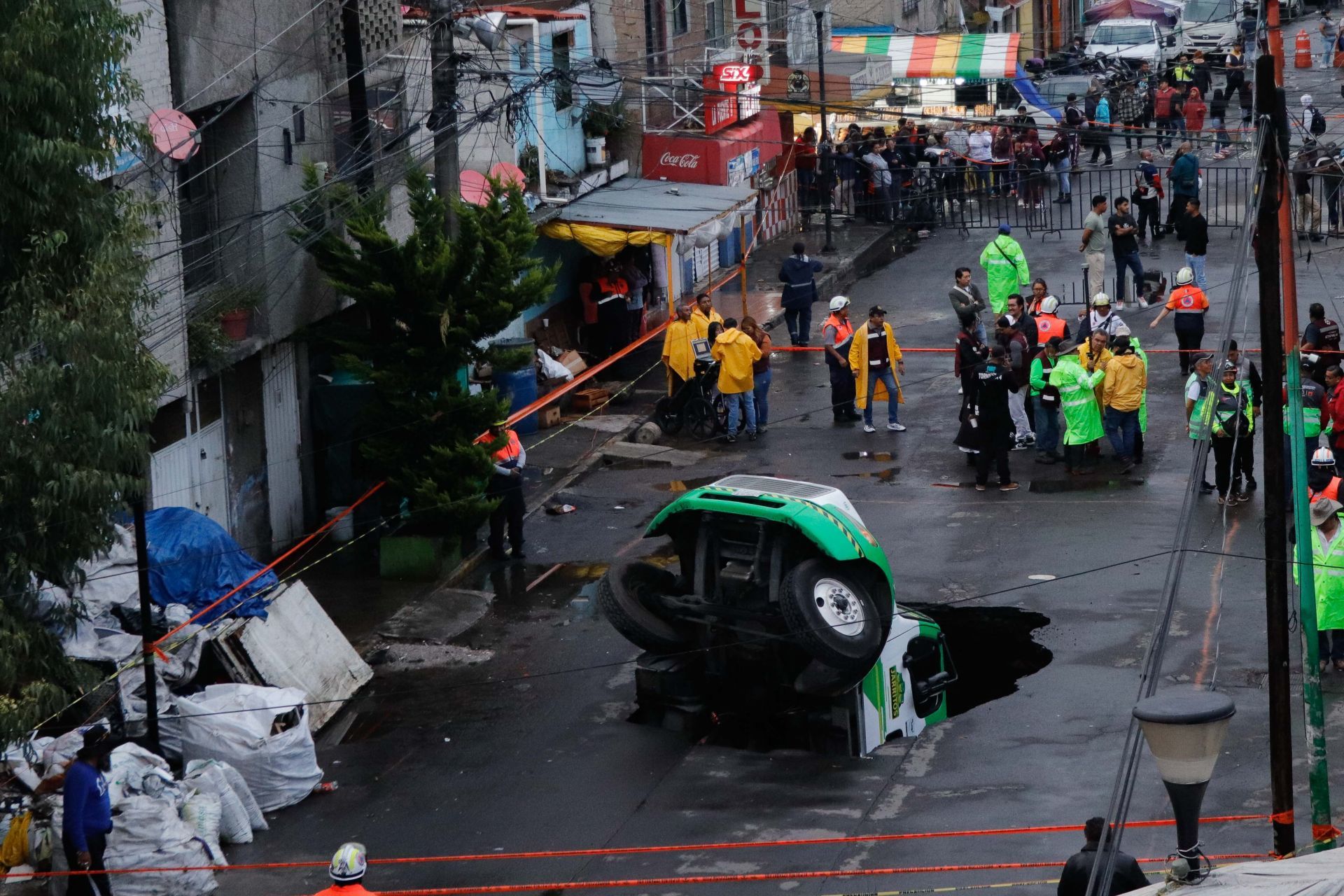 EMEEQUIS.– Después de la explosión de la pipa, ahora un socavón gigante se tragó un camión repartidor de refrescos en Iztapalapa: ¿las causas? las autoridades mencionan el alcantarillado obsoleto.