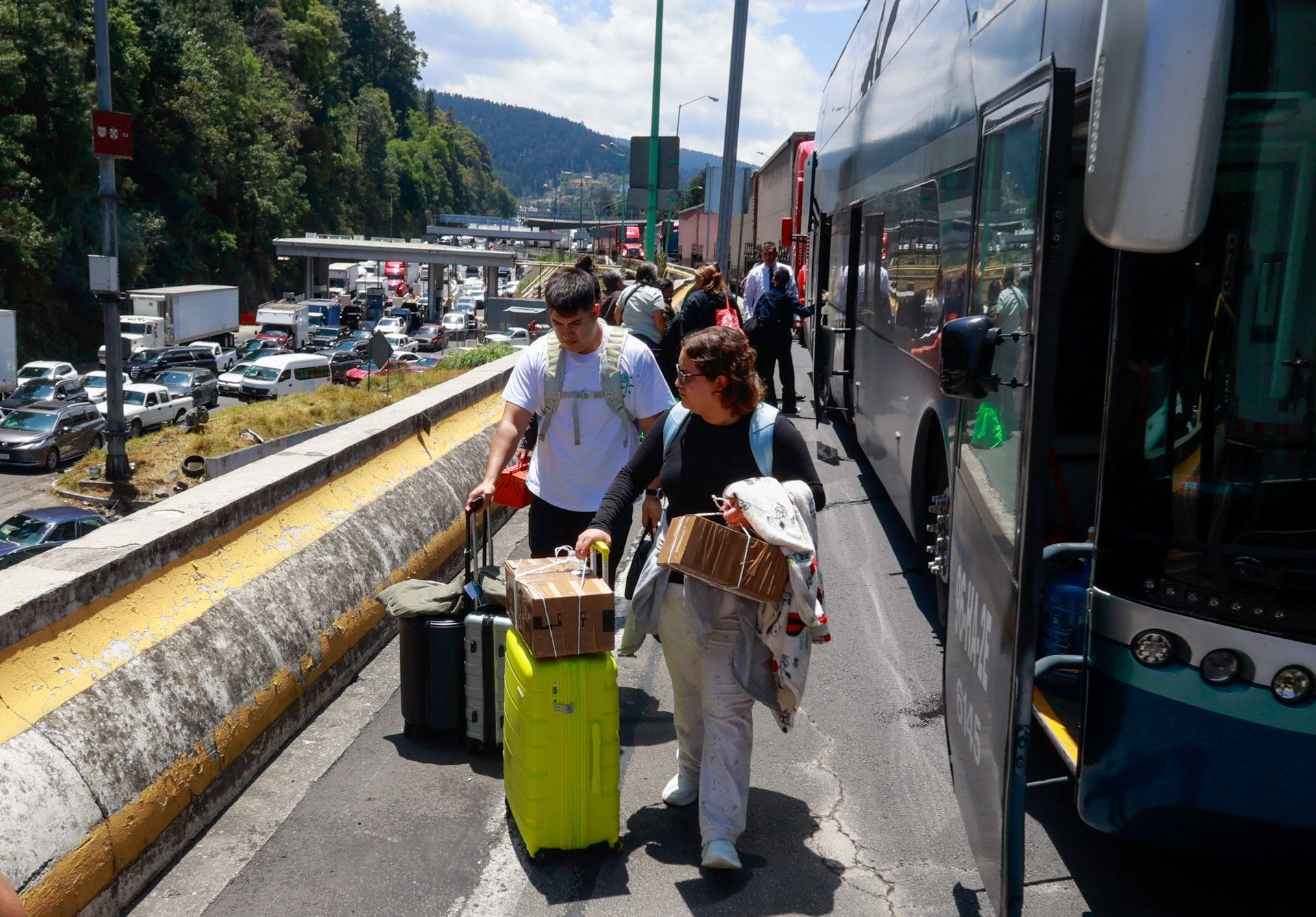 Sigue el caos carretero. Algunos usuarios de líneas de transporte con dirección a la CDMX prefirieron bajarse de los autobuses y caminar para poder llegar a su destino ya que Integrantes del Frente Nacional para el Rescate del Campo Mexicano y Productores Unidos del Volcán dieron paso libre a automovilista. Foto: Crisanta Espinosa Aguilar / Cuartoscuro.com.