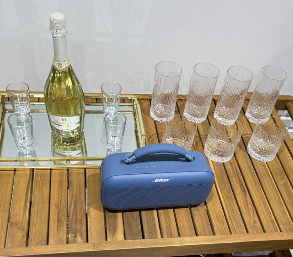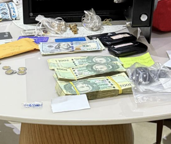 En una mesa de centro se expone una caja fuerte abierta con fajos de billetes de 100,000 guaraníes (258 pesos mexicanos cada uno) alrededor, así como joyas y objetos de valor. Asimismo, se observa en otra imagen una botella de vino espumoso Prosecco que tiene un costo aproximado de 300 pesos en México llena y con varios vasos alrededor.