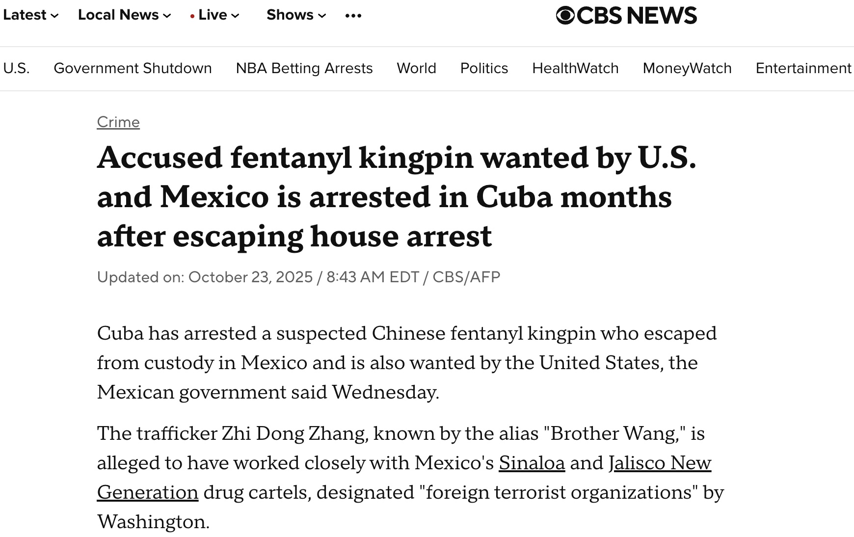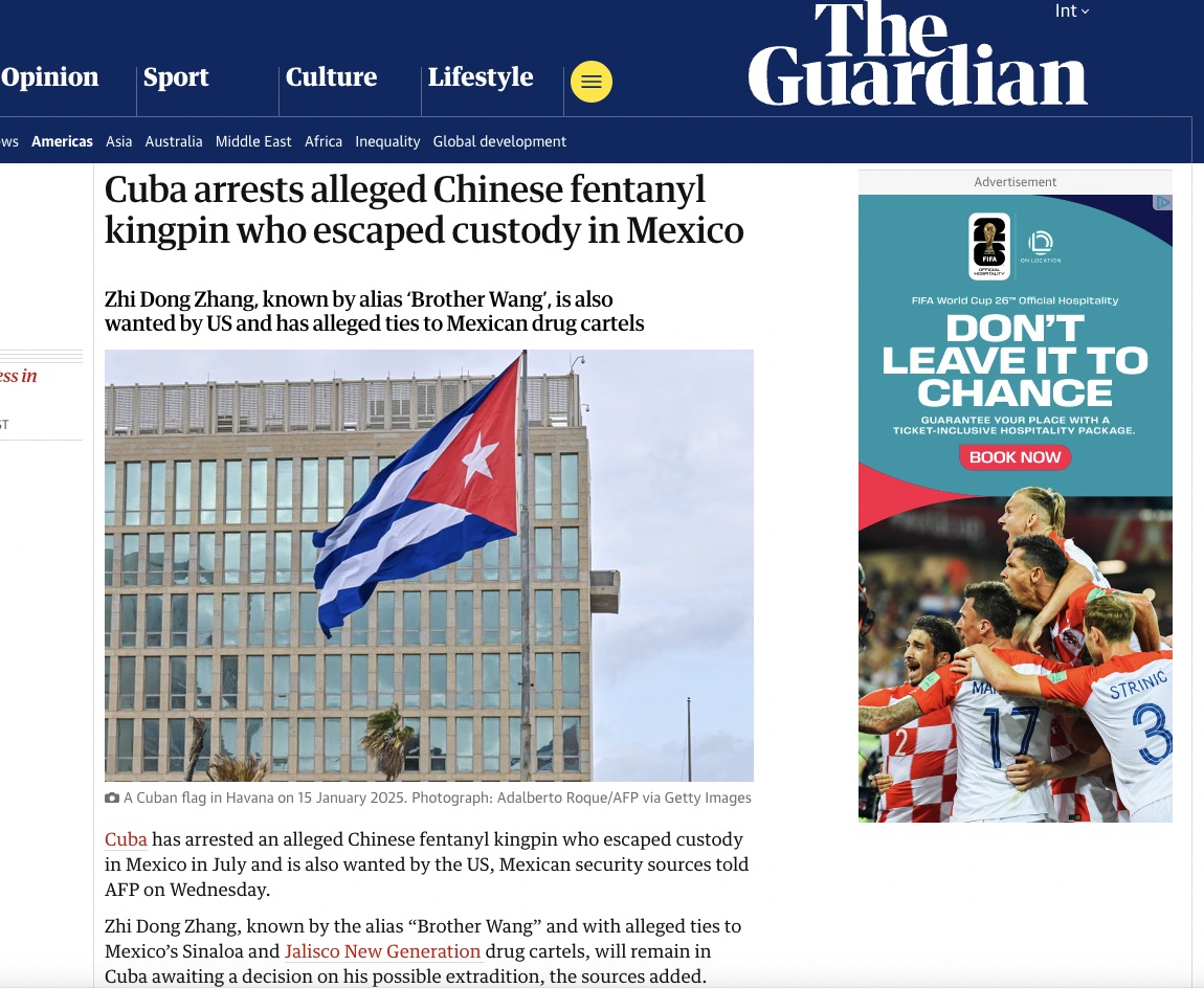 Zhi Dong Zhang, alias “Brother Wang”, acapara titulares a nivel internacional tras ser recapturado en Cuba luego de fugarse de México. Medios como ABC News, Al Jazeera, The Guardian y CBS destacan su rol como presunto capo del fentanilo vinculado a los cárteles de Sinaloa y CJNG, mientras crecen las dudas sobre si será extraditado a Estados Unidos, debido a la enemistad con el país isleño.