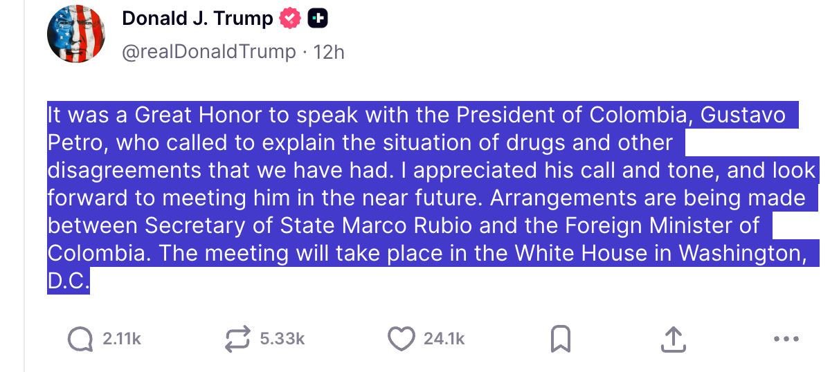 Trump usó su acostumbrada Truth Social para hablar positivamente del diálogo, pero dijo que fue Petro quien lo llamó. “Fue un gran honor hablar con el presidente de Colombia, Gustavo Petro, quien me llamó para explicar la situación de las drogas y otros desacuerdos que hemos tenido. Agradecí su llamada y su tono, y espero reunirme con él próximamente. El secretario de Estado, Marco Rubio, y el ministro de Relaciones Exteriores de Colombia están realizando los arreglos necesarios. La reunión tendrá lugar en la Casa Blanca, en Washington, D. C”.
