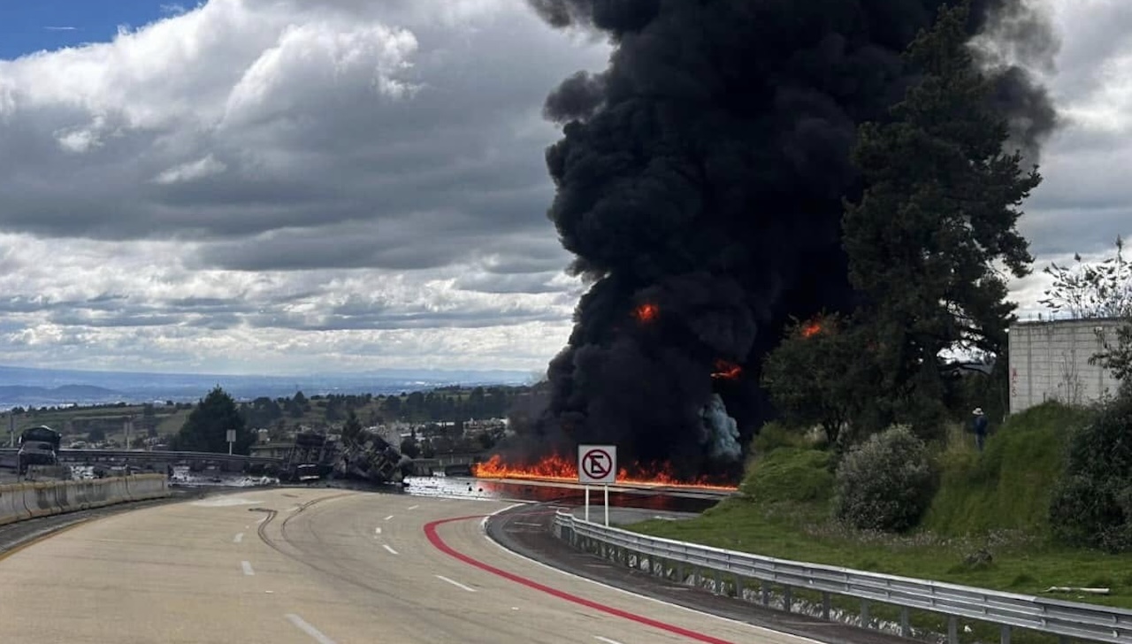 Tras el choque de una pipa con un tractocamión en la autopista México-Puebla, la columna de humo se podía ver desde lejos. Hay un herido de gravedad y autoridades investigan para deslindar responsabilidades.