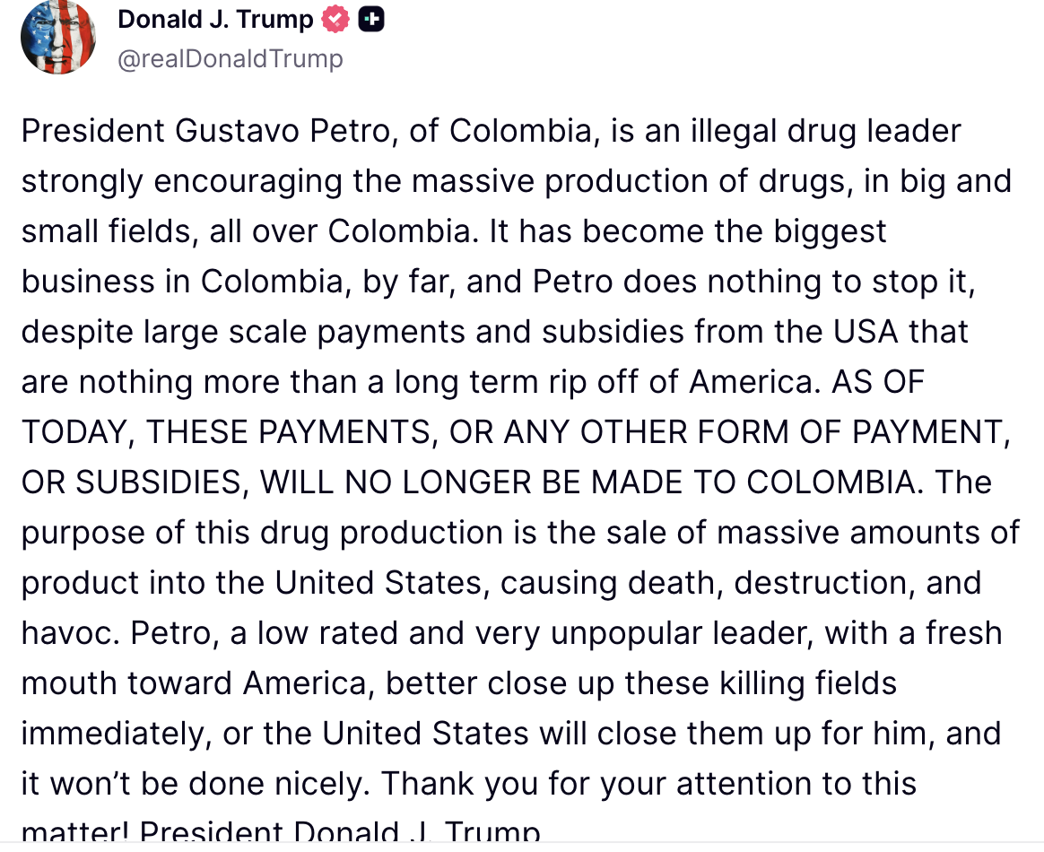 “A partir de hoy, estos pagos, o cualquier otra forma de pago o subsidio, dejarán de realizarse a Colombia. El propósito de esta producción de drogas es la venta masiva de productos a Estados Unidos, causando muerte, destrucción y estragos. Petro, un líder poco reconocido y muy impopular, con una actitud fresca hacia Estados Unidos, debería cerrar estos campos de exterminio de inmediato, o Estados Unidos se los cerrará, y no será bien recibido. ¡Gracias por su atención a este asunto!”, dijo Trump en Truth Social, en un mensaje en el que escribió “Columbia” (como la universidad en Nueva York) en lugar de “Colombia”, aunque luego corrigió.