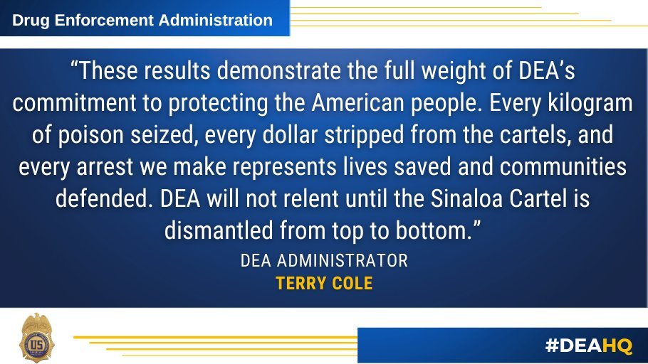 El administrador de la DEA, Terry Cole, celebró los resultados: “Cada kilo de veneno asegurado, cada dólar arrancado a los cárteles y cada arresto que hacemos representa vidas salvadas y comunidades defendidas. La DEA no descansará hasta que el Cártel de Sinaloa sea desmantelado desde lo más alto a lo más bajo”.