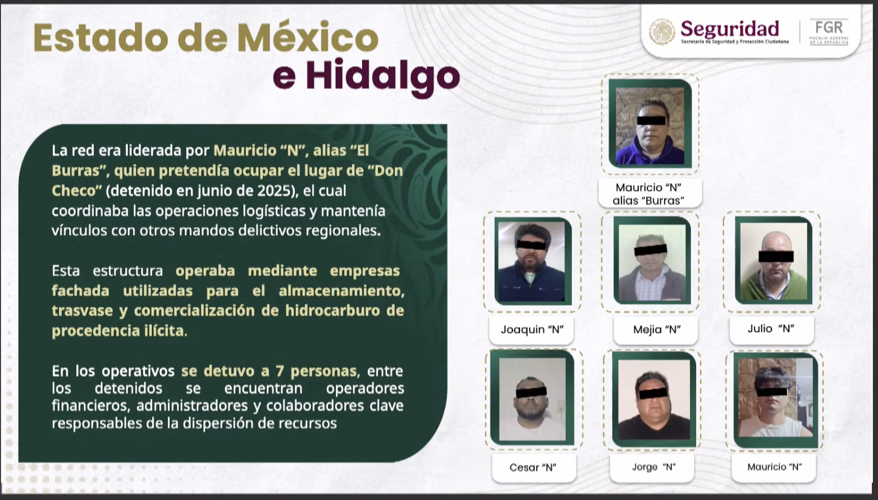 EMEEQUIS.– El Gabinete de Seguridad dio a conocer el desmantelamiento de una red de huachicol liderada por Mauricio “N”, alias “El Burras”, ligado al CJNG, quien pretendía ocupar el lugar de “Don Checo”, detenido en junio de 2025.