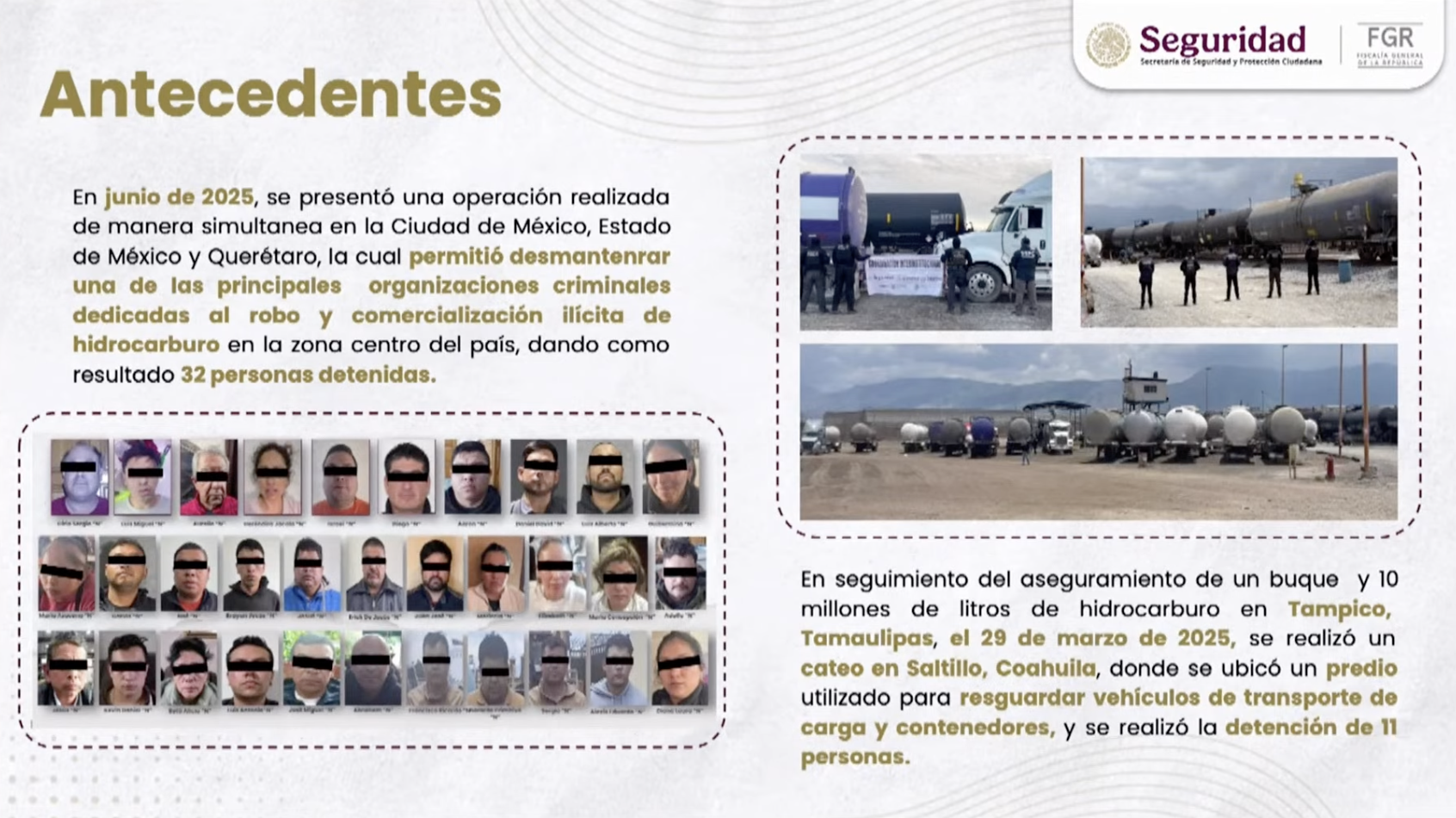 “Las investigaciones han permitido identificar que estas estructuras empresariales ilícitas operan mediante un esquema logístico multimodal que combina de manera coordinada los transportes marítimo, ferroviario y terrestre para la introducción, traslado, almacenamiento y comercialización ilegal de hidrocarburos, que llegó a operar en los estados de Tamaulipas, Querétaro y Jalisco.