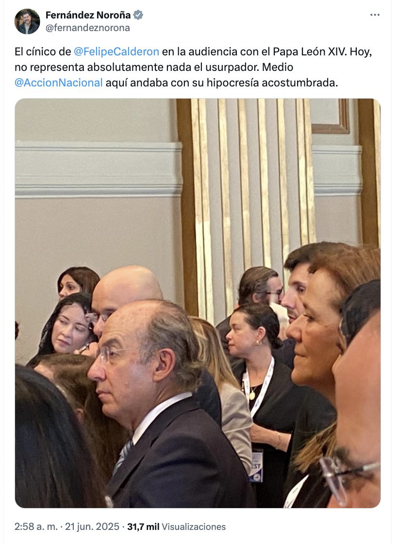 EMEEQUIS.– Gerardo Fernández Noroña coincidió con Felipe Calderón y panistas en audiencia con el Papa León XIV en Roma y por medio de la red social X despotricó: “El cínico de @FelipeCalderon en la audiencia con el Papa León XIV. Hoy, no representa absolutamente nada el usurpador. Medio @AccionNacional aquí andaba con su hipocresía acostumbrada”.