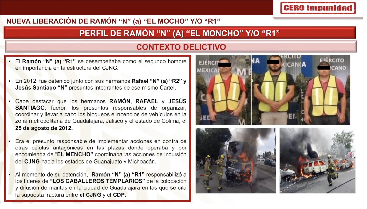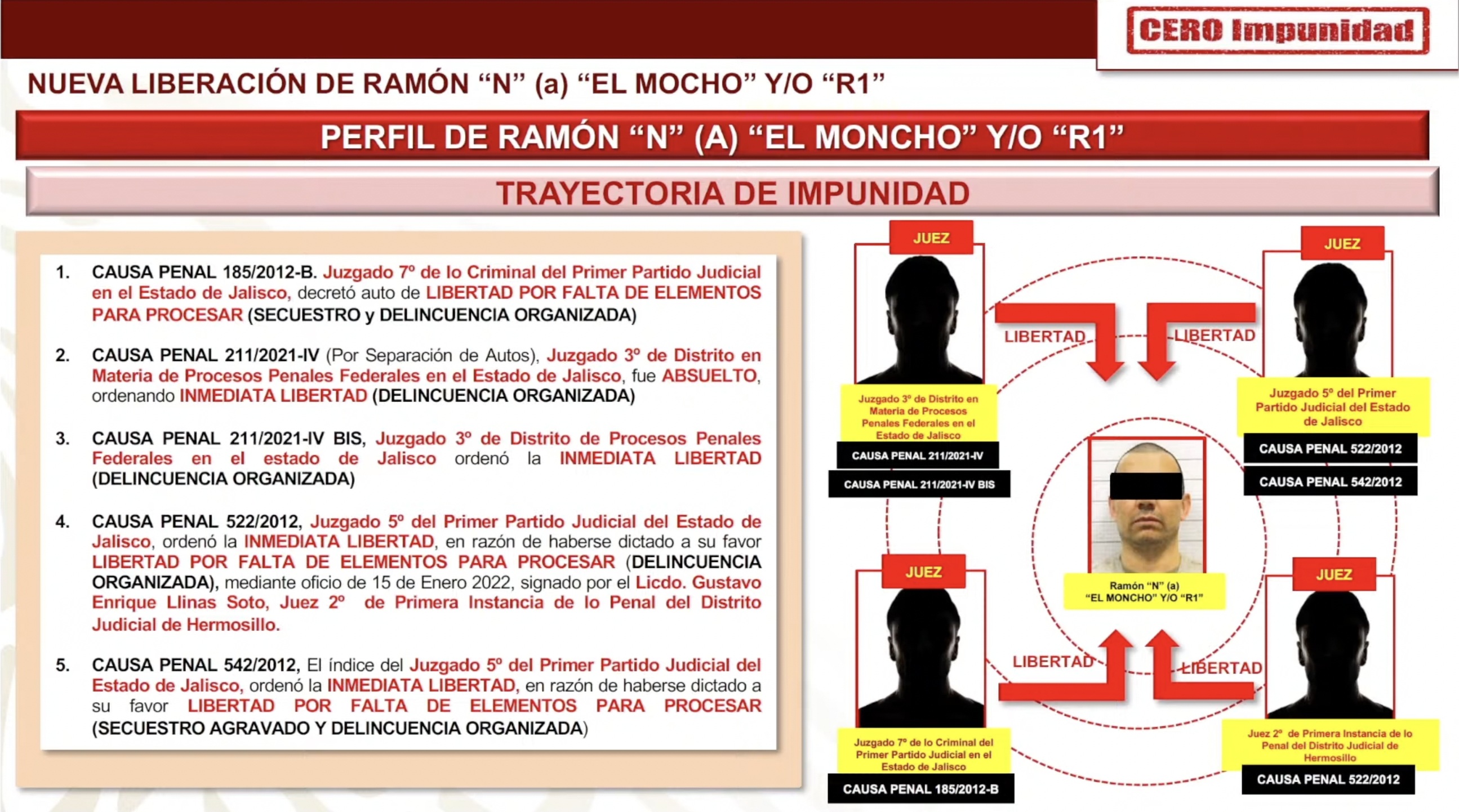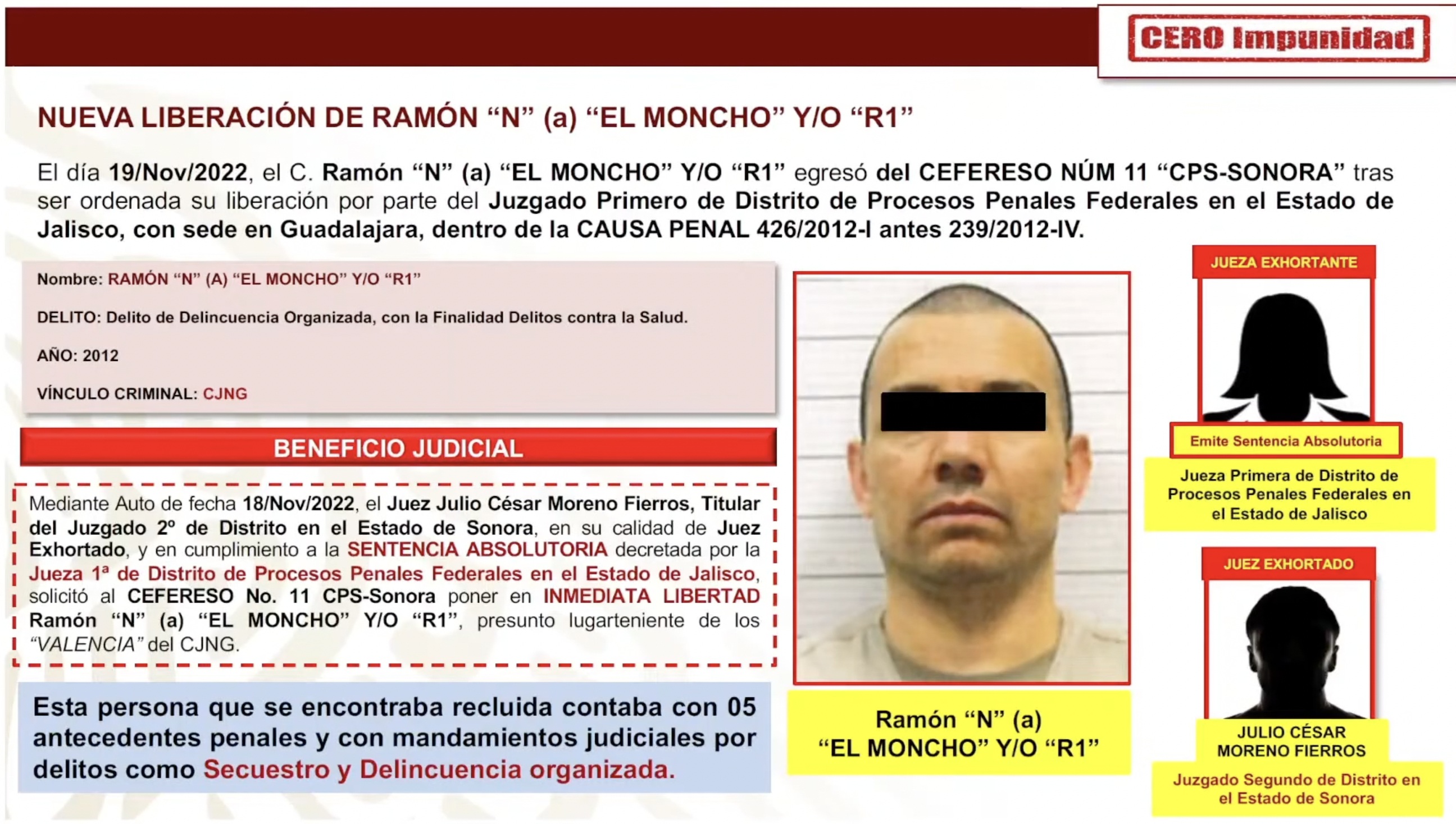 “Estaba acusado por los delitos de delincuencia organizada con la finalidad de delitos contra la salud y la jueza 1 de Procesos Penales del estado de Jalisco solicitó poner en libertad inmediata a este sujeto, quien primero fue lugarteniente de Los Valencia, de una organización delictiva, y después del cártel Jalisco Nueva Generación.
