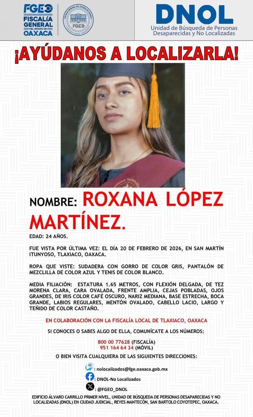 La desaparición de Roxana López Martínez, una ingeniera agrónoma de 24 años, ha desatado una crisis sin precedentes en el municipio triqui de San Martín Itunyoso, donde la comunidad denuncia un vacío de autoridad y la posible protección política hacia los sospechosos. Vista por última vez el 20 de febrero en compañía de su novio —quien es sobrino del presidente municipal vigente—, su caso pone al descubierto la grave emergencia que vive Oaxaca, donde se reportan seis desapariciones cada 24 horas bajo una absoluta omisión institucional por parte de la Fiscalía estatal, que hasta la fecha no ha iniciado operativos de búsqueda ni investigaciones exhaustivas contra el entorno del edil