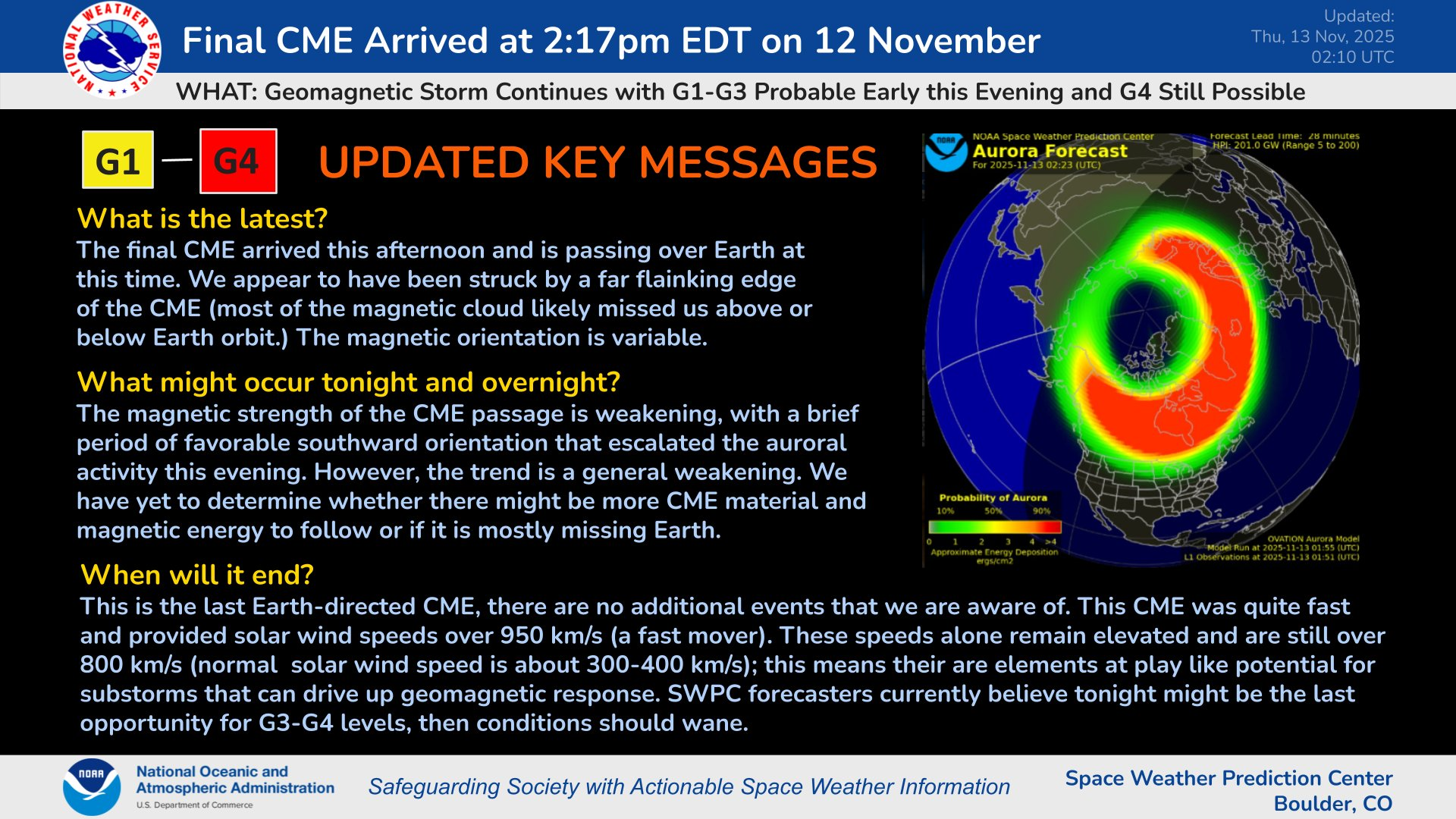 La NOAA advierte que este jueves 13 de noviembre una tormenta solar severa (G4) impactará la Tierra, con posibles interferencias en satélites, GPS, comunicaciones por radio y redes eléctricas. En el norte de México, especialmente en Chihuahua y Baja California, podría observarse nuevamente el fenómeno de auroras boreales, tras la tormenta del 12 de noviembre.