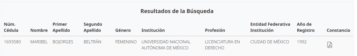 Maribel Bojorges también cuenta con licenciatura mencionada en el Registro Nacional de Profesionistas, su alta se dio en 1992.