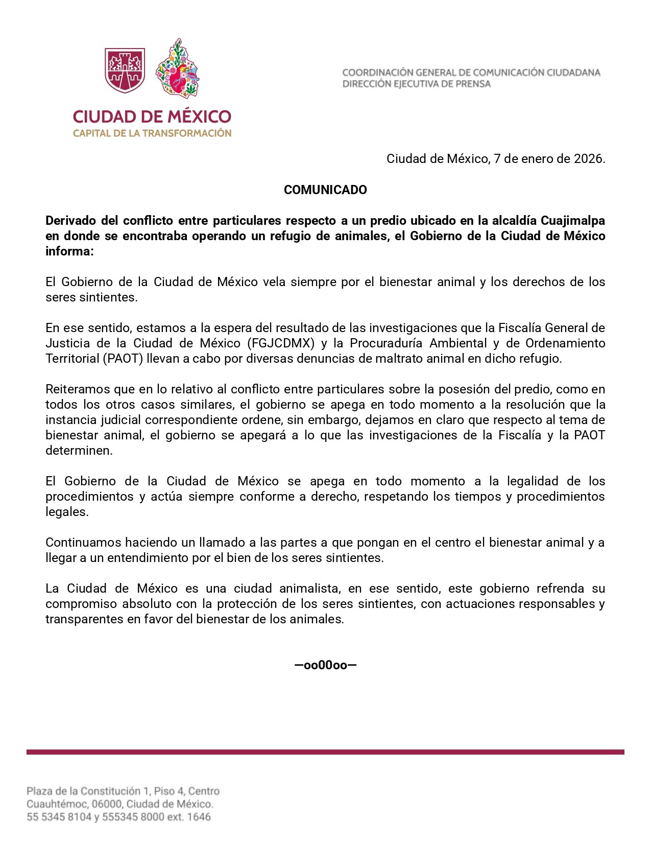 “Reiteramos que en lo relativo al conflicto entre particulares sobre la posesión del predio, como en todos los otros casos similares, el gobierno se apega en todo momento a la resolución que la instancia judicial correspondiente ordene, sin embargo, dejamos en claro que respecto al tema de bienestar animal, el gobierno se apegará a lo que las investigaciones de la Fiscalía y la PAOT determinen”.