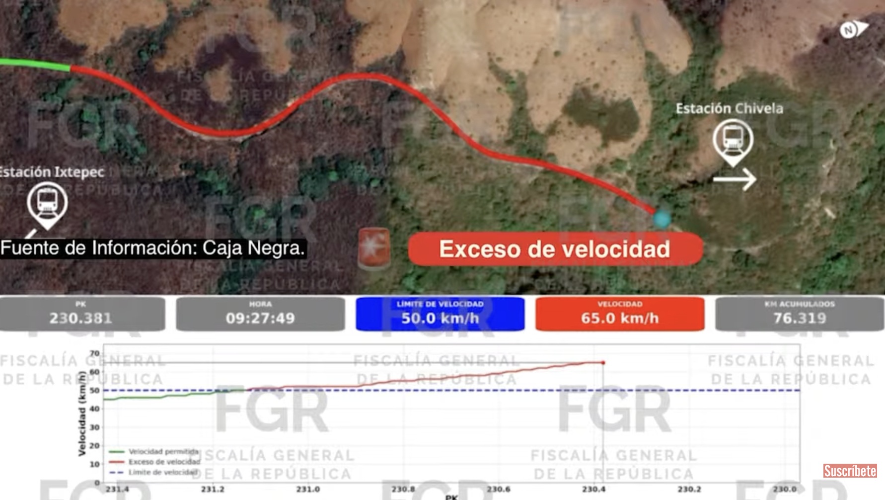 “La velocidad máxima estipulada para el tramo donde se localiza el lugar del siniestro es de 45 kilómetros por hora para el servicio de carga, y de 50 kilómetros por hora en el servicio de pasajeros. En este punto es necesario destacar que la velocidad autorizada era de 50 kilómetros por hora, sin embargo, el tren viajaba a 65 kilómetros por hora, de acuerdo con los registros de la caja negra”.