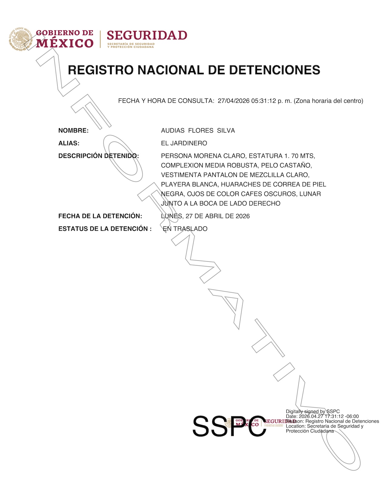 En su ficha del Registro Nacional de Detenciones se le describe: “PERSONA MORENA CLARO, ESTATURA 1. 70 MTS, COMPLEXION MEDIA ROBUSTA, PELO CASTAÑO, VESTIMENTA PANTALON DE MEZCLILLA CLARO, PLAYERA BLANCA, HUARACHES DE CORREA DE PIEL NEGRA, OJOS DE COLOR CAFES OSCUROS, LUNAR JUNTO A LA BOCA DE LADO DERECHO”.