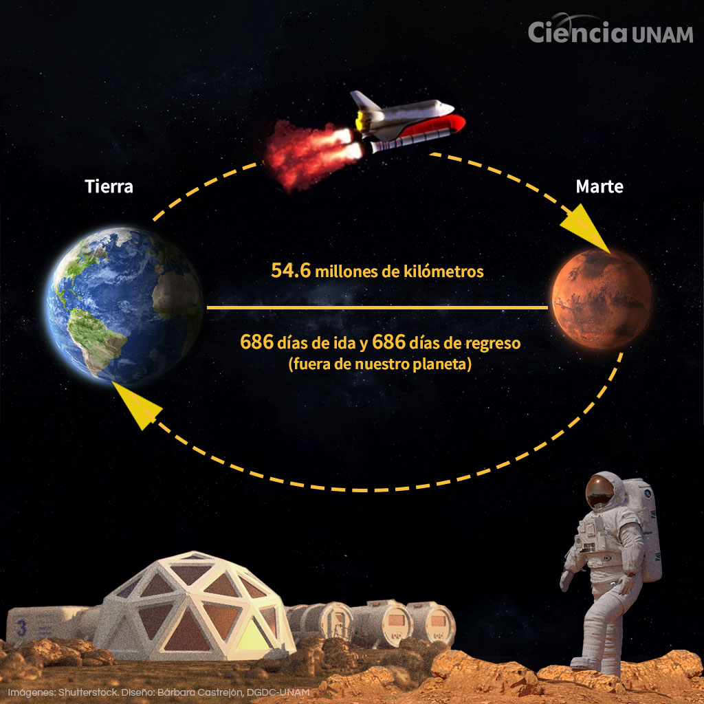 De acuerdo con la UNAM, el planeta Marte se encuentra a unos 54.6 millones de kilómetros de la Tierra. Se calcula que es 140 veces la distancia de la Tierra a la Luna. Llegar allá implica un viaje de unos 686 días, casi dos años, más el tiempo que requiera la exploración y luego el regreso, por lo que en este cálculo serían más de cuatro años.