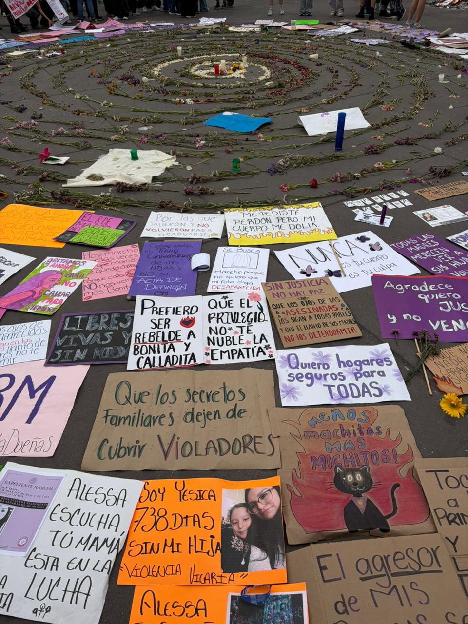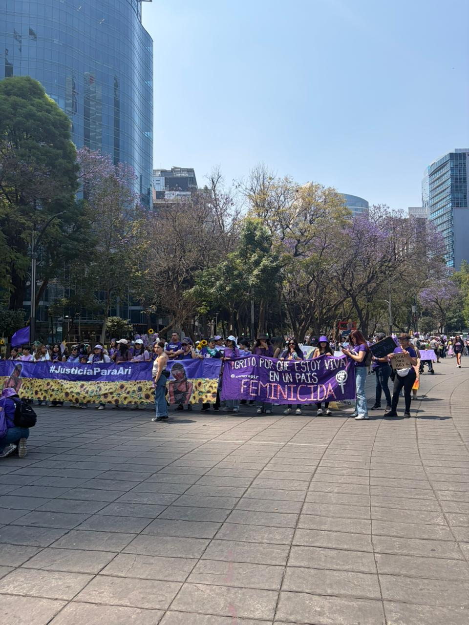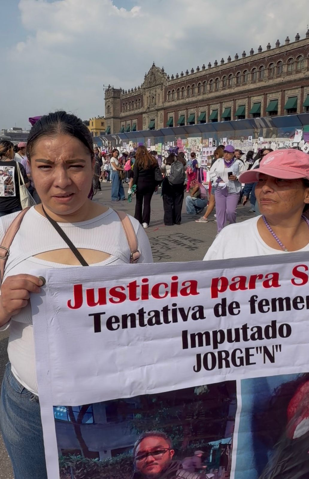 En la plancha del Zócalo frente a Palacio Nacional, tras marchar, Sheila Roxana sostuvo una pancarta en la que ella misma denunció haber sido víctima de una tentativa de feminicidio por parte de su ex pareja en la alcaldía Benito Juárez.