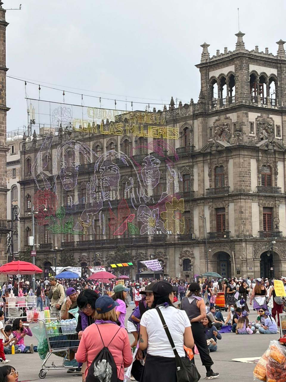En la plancha del Zócalo, mientras grupos de mujeres descansaron, otras lloraron a sus hijos desaparecidos y otras más patean las vallas, un mensaje de decoración en la entrada de 20 de noviembre, similar a la que se usa para iluminar por las fiestas patrias y navidad, un mensaje incomodó a algunas asistentes: “Ciudad feminista con las mujeres” junto a la imagen que también fue proyectada un día atrás.