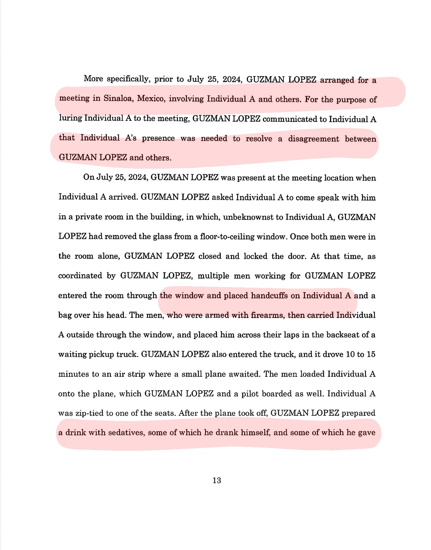 “Guzmán López también subió a la camioneta, que condujo de 10 a 15 minutos hasta una pista de aterrizaje donde los esperaba una avioneta. Los hombres subieron al Individuo A a la avioneta, a la que también subieron Guzmán López y un piloto. El Individuo A fue atado a uno de los asientos. Después del despegue, Guzmán López preparó una bebida con sedantes, algunos de los cuales bebió él mismo y otros se los dio al Individuo A”.