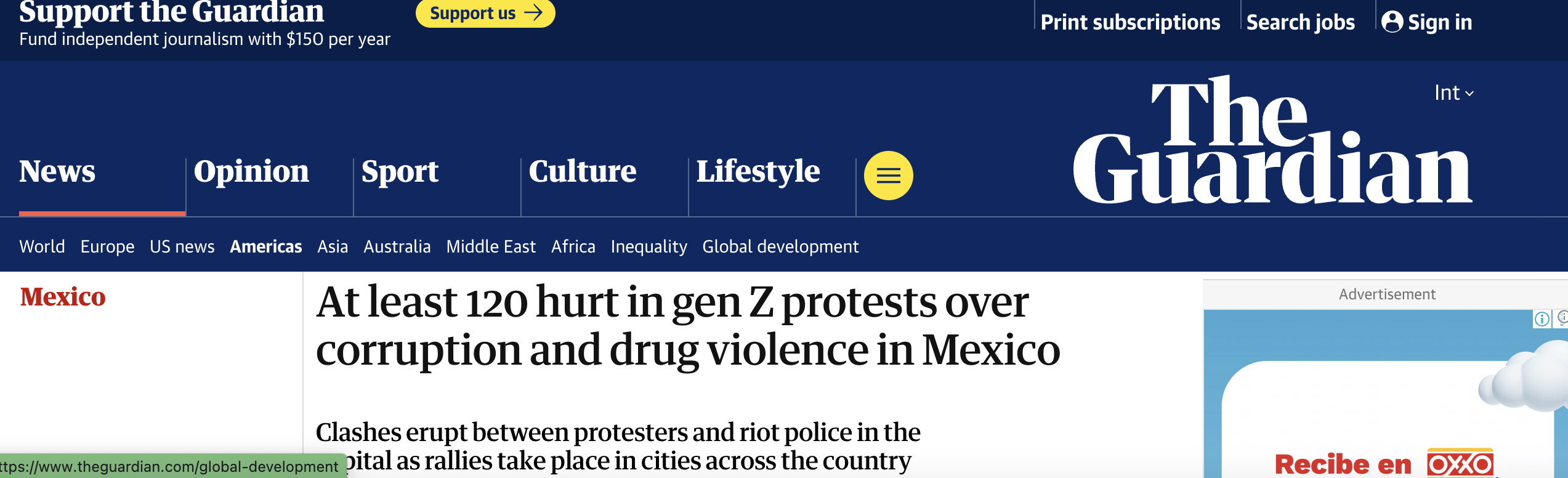 The Guardian puso el foco en el saldo humano reportando: “Al menos 120 heridos en las protestas de la Generación Z por corrupción y violencia del narcotráfico en México”.