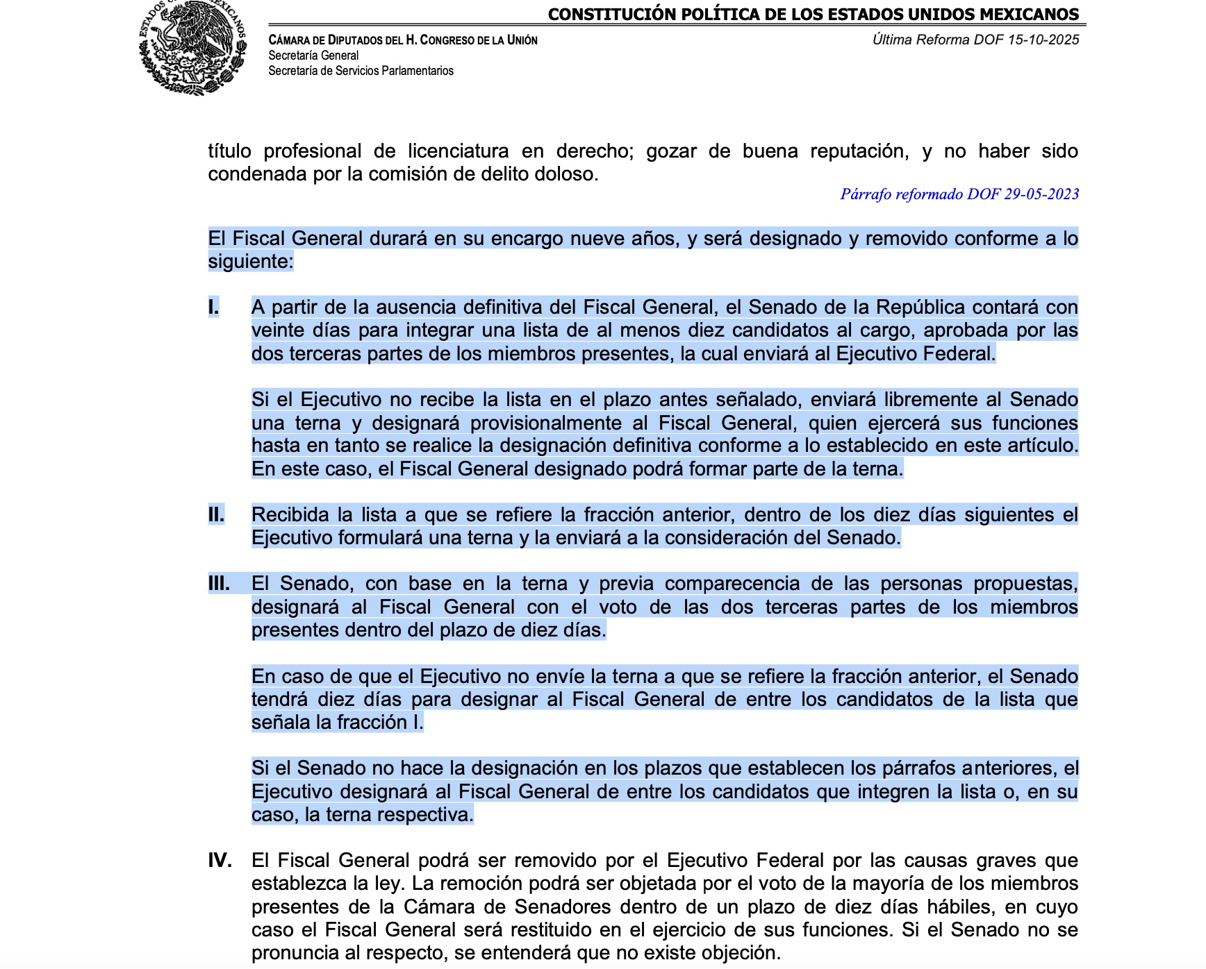 El artículo 102 de la Constitución Política de los Estados Unidos Mexicanos (CPEUM) señala que, a partir de la ausencia definitiva del Fiscal General, el Senado de la República contará con 20 días para integrar una lista de al menos 10 candidatos al cargo, aprobada por las dos terceras partes de los miembros presentes, la cual enviará al Ejecutivo Federal, lo cual ya ocurrió.