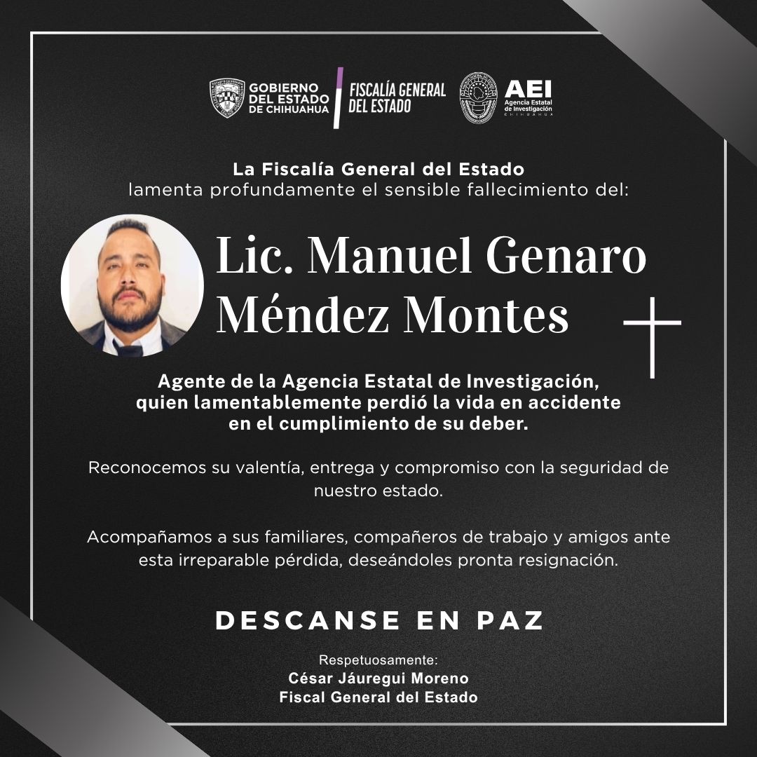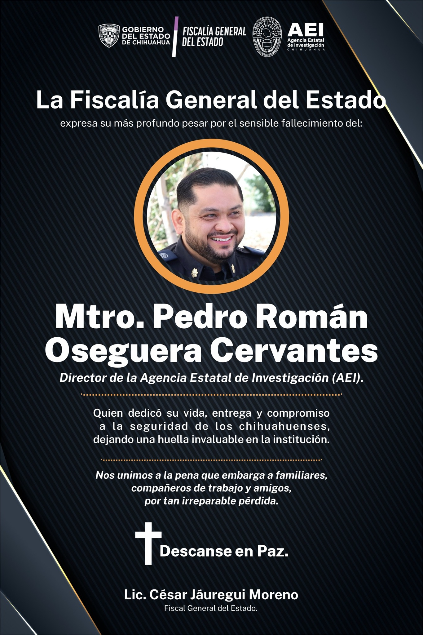 “Quiero expresar mi más sentido pésame a los familiares, amistades y compañeros de Pedro Román Oseguera Cervantes, quien perdió la vida en cumplimiento de su deber, trabajando por la paz y la seguridad de los chihuahuenses”, publicó.