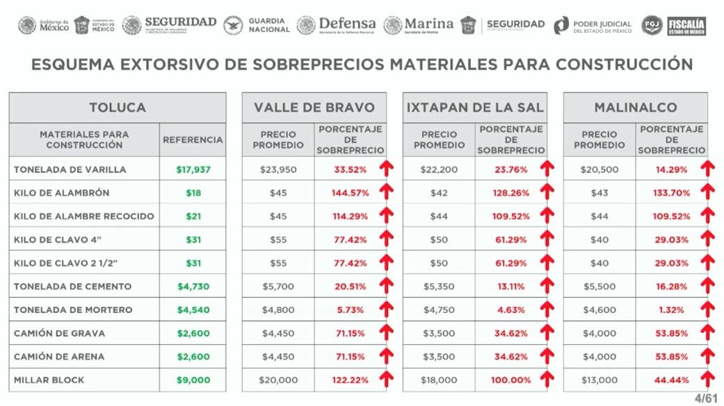 Se presentaron ejemplos de precios artificialmente inflados que los pobladores tenían que pagar. La tonelada de varilla, que está normalmente en 17,937 pesos, se vendía en 23,950, un 33.52% más alto.