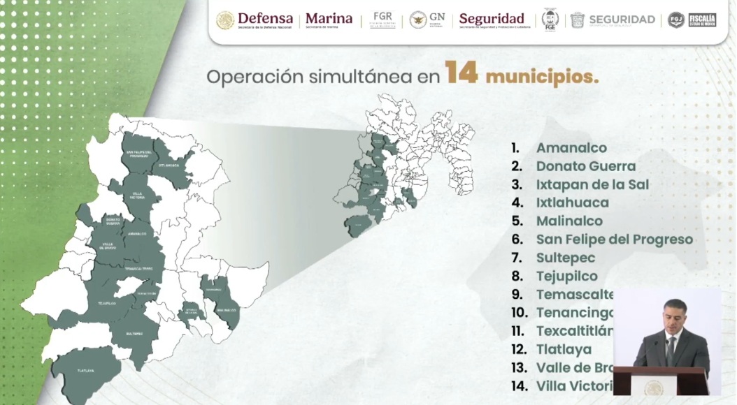 Intervinieron la Fiscalía General de Justicia del Estado de México, la Secretaría de Seguridad del Estado de México, la Secretaría de Defensa, la Marina, la Guardia Nacional y la Secretaría de Seguridad y Protección Ciudadana del Gobierno de México para realizar cateos simultáneos en 14 municipios de la entidad.