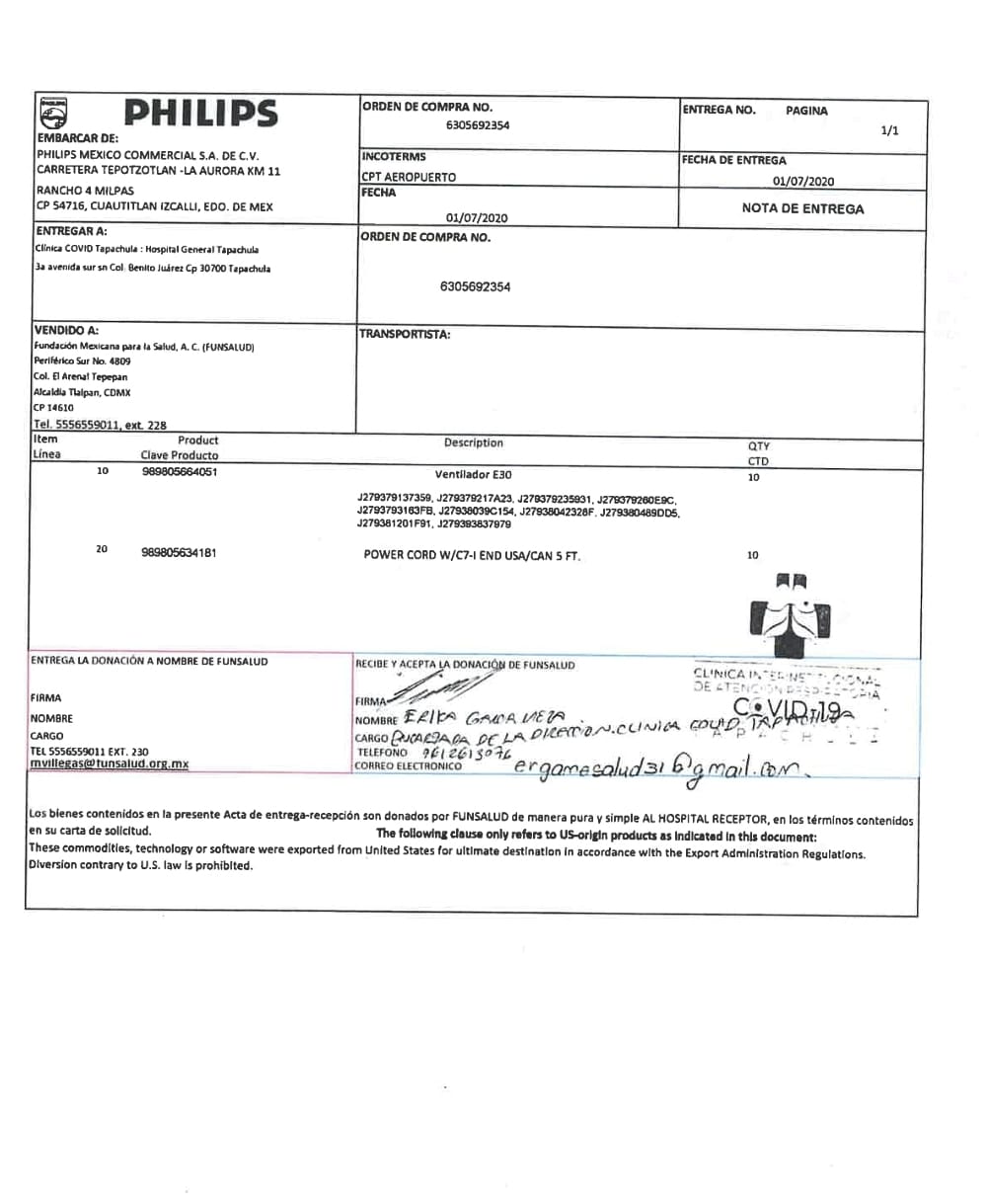 Asimismo, Philips afirma que los ventiladores E30 fueron donados en México durante la pandemia. Sin embargo, facturas revisadas por este medio prueban que muchos de estos equipos fueron comprados directamente a Philips México, lo que contradice la versión de la empresa.