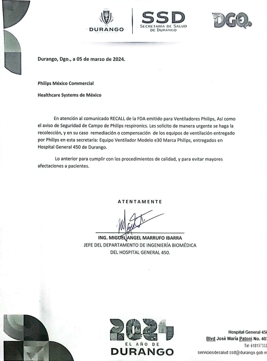 Carta enviada por hospitales de Durango en 2024 para solicitar a Philips México y a su distribuidor la recolección del ventilador, actualmente los ventiladores siguen en el hospital.