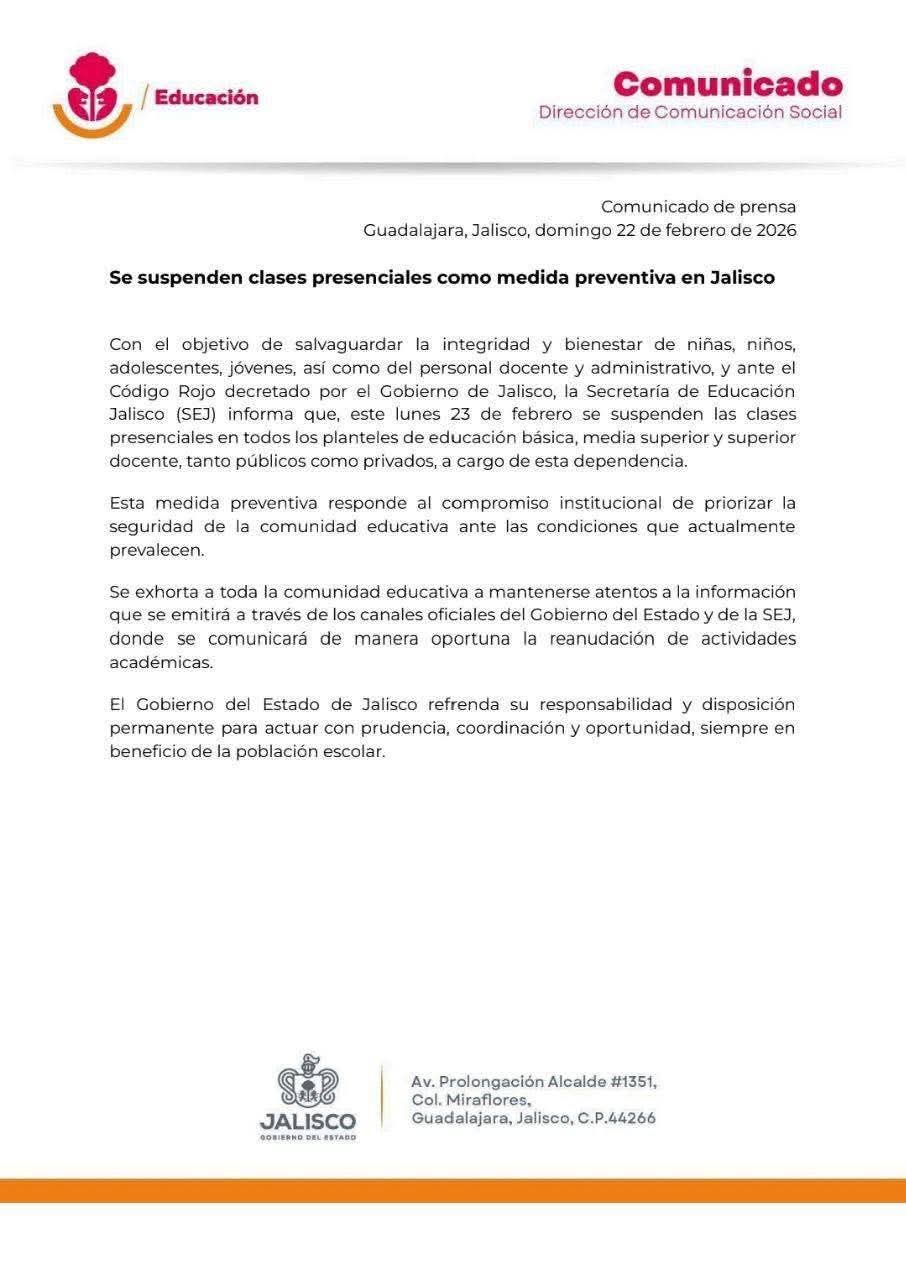 Como medida preventiva ante los eventos de violencia en estados vecinos, la Secretaría de Gobierno informó la suspensión de clases presenciales en todos los planteles de educación básica, media superior y superior. Las autoridades enfatizaron que la entidad se mantiene en calma, pero actúa bajo un “principio de prudencia”.