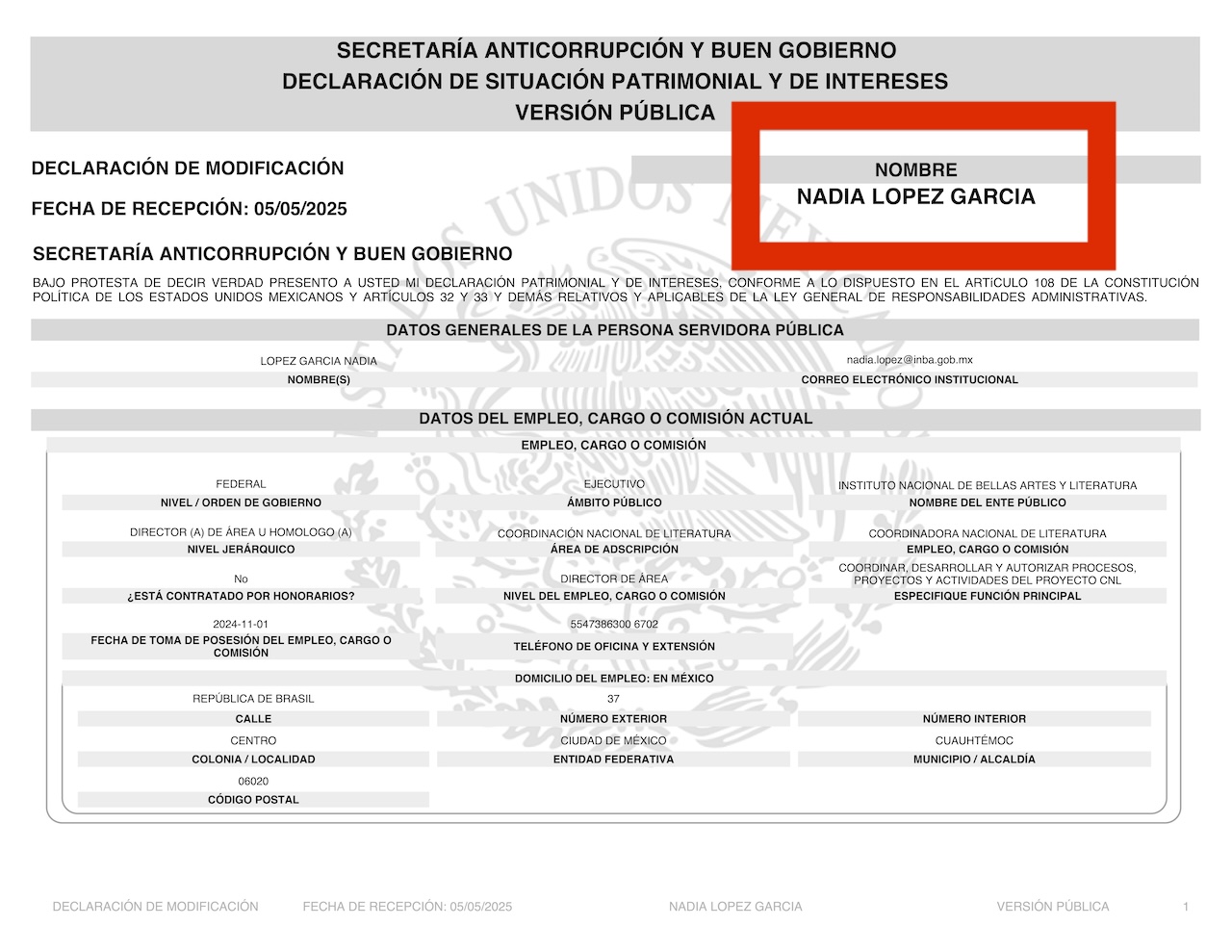 En su declaración patrimonial, en el rubro de “remuneración anual neta del declarante por su cargo público”, Nadia López García registró solamente 125,386 pesos (10,400 al mes), lo cual no concuerda con su salario.