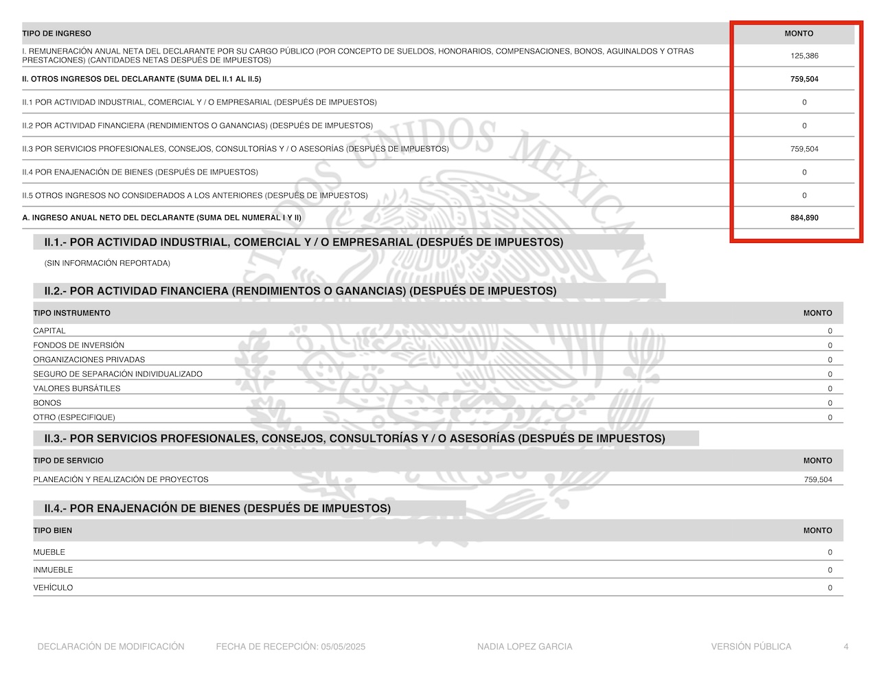 Lo cual da una remuneración total, según su declaración, de 884,890 pesos.