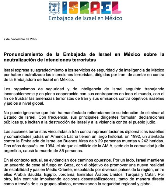 La embajada de Israel dijo corroboró: “Israel expresa su agradecimiento a los servicios de seguridad y de inteligencia de México por haber neutralizado las intenciones terroristas, dirigidas por Irán, de atentar en contra de la Embajadora de Israel en México.