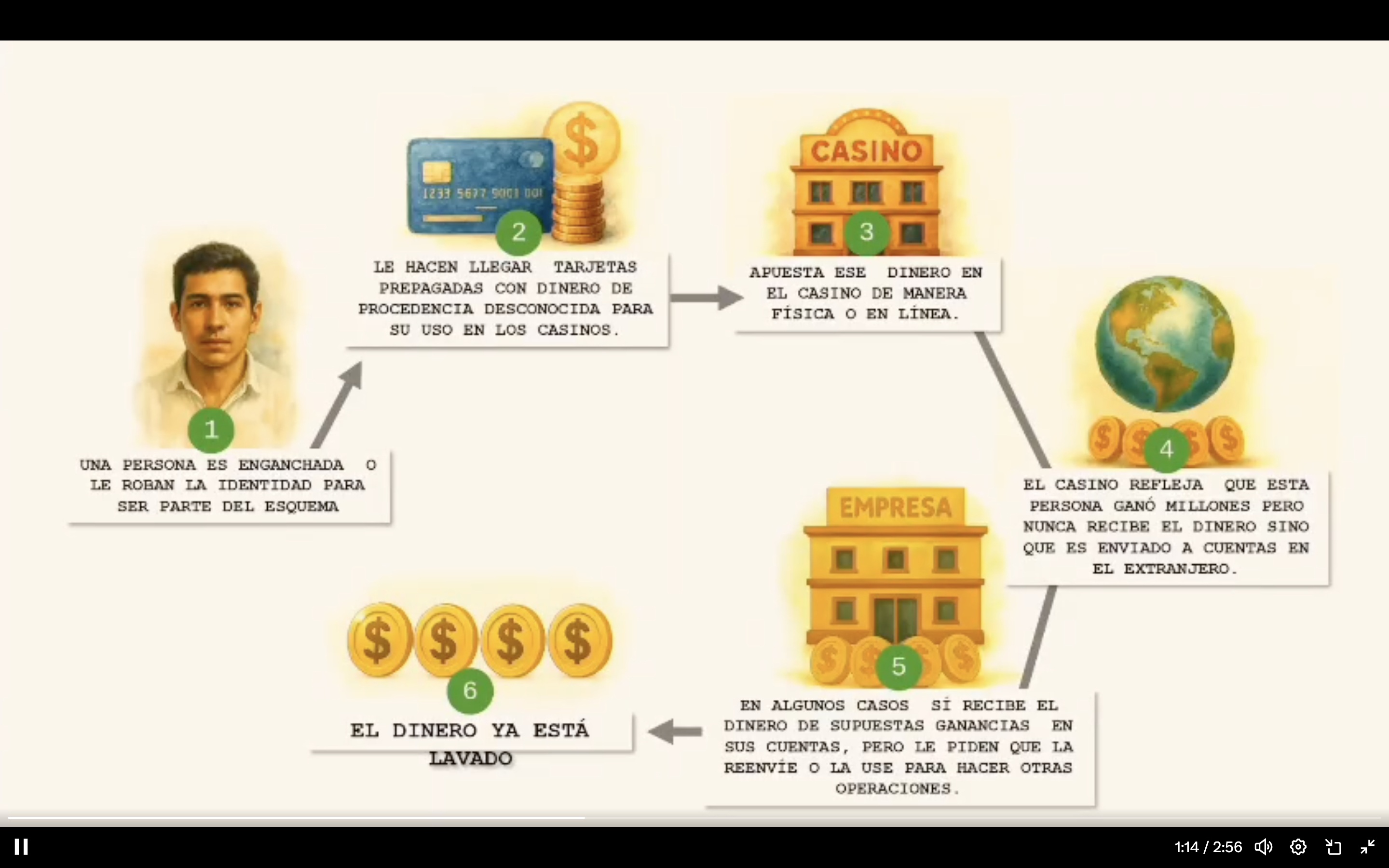 “Segundo, por medios electrónicos se les envían tarjetas prepagadas o códigos premiados con dinero de procedencia desconocida, que pueden usarse en casinos físicos o en línea.