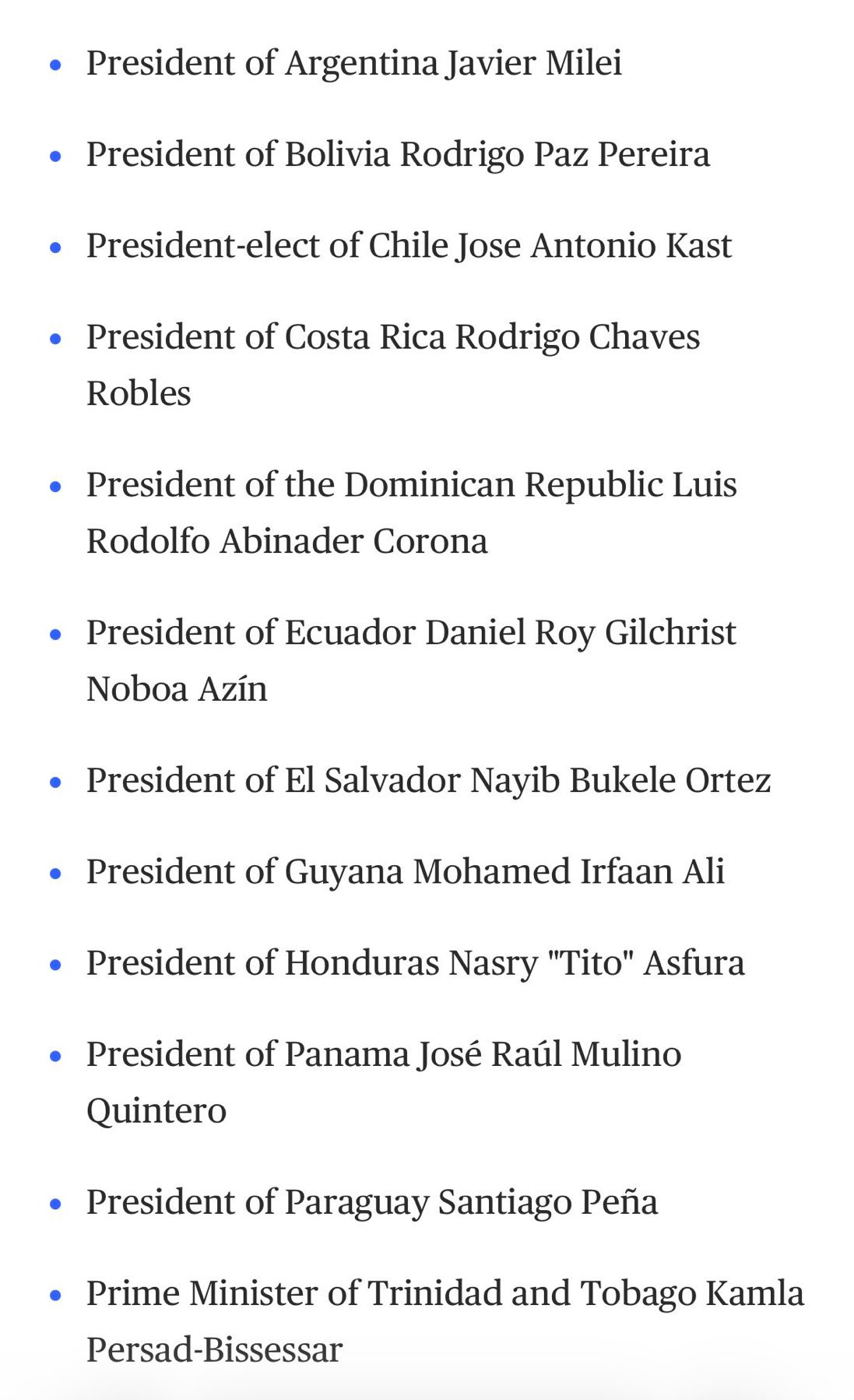 Por ahora, Leavitt indicó que el presidente recibirá a jefes de estado de Argentina, Bolivia, Chile, Costa Rica, República Dominicana, Ecuador, El Salvador, Honduras, Panamá, Paraguay, Trinidad y Tobago, y quizás también de otros países.
