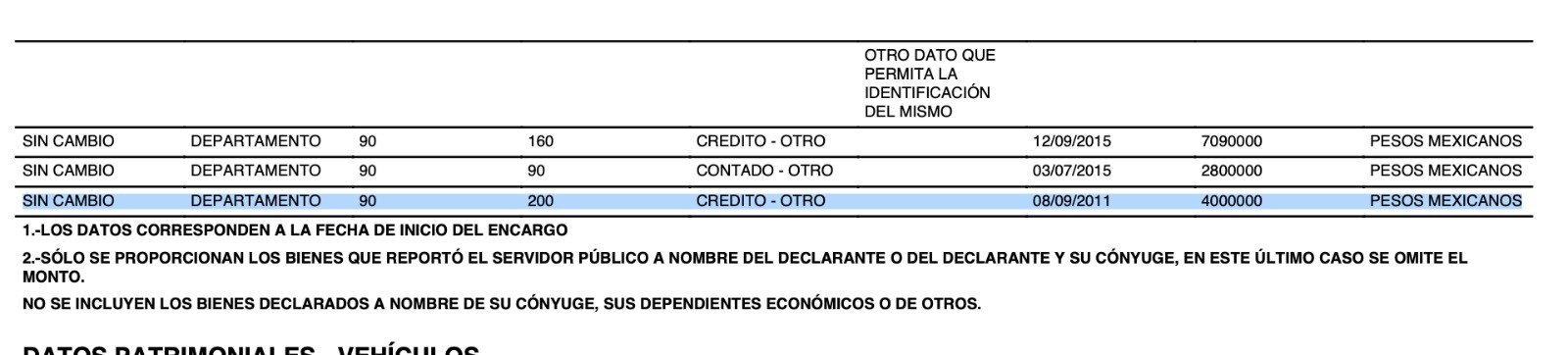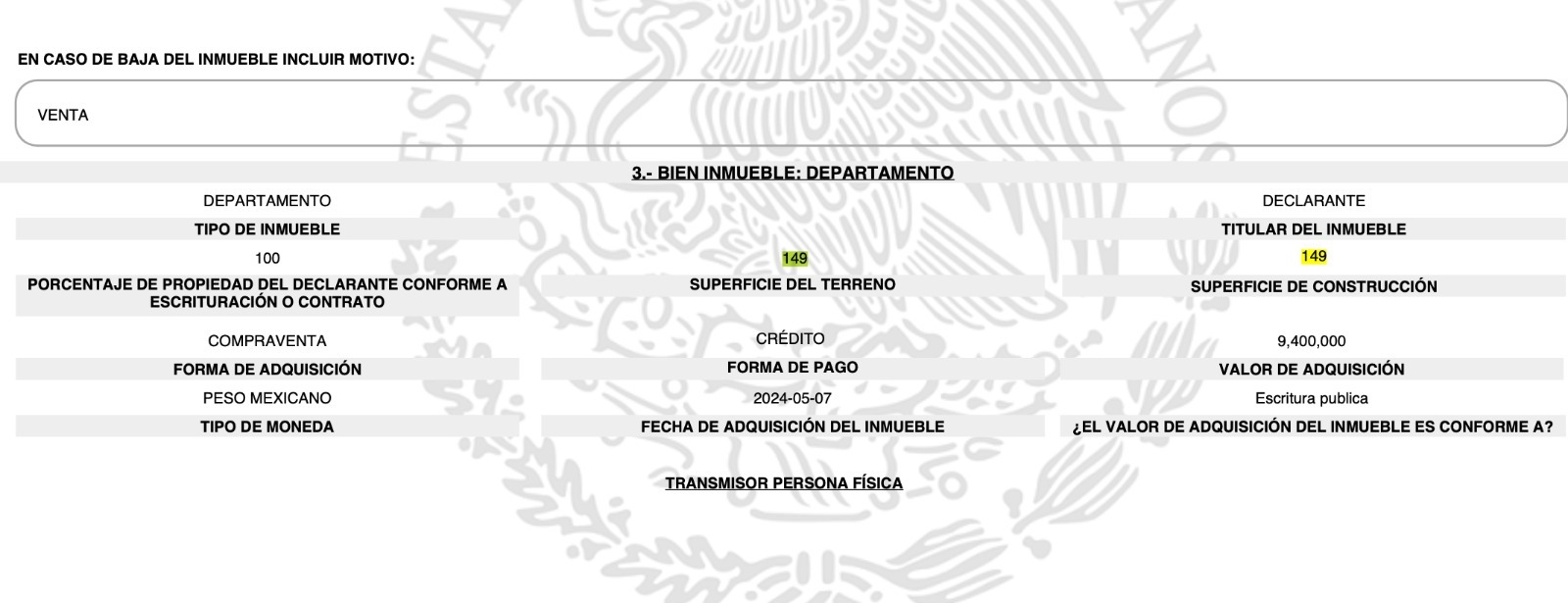 De acuerdo con la declaración, el 7 de mayo de 2024 vendió un departamento por 9 millones 400 mil pesos, de 149 metros cuadrados, a una persona física y mediante crédito. Sin embargo, EMEEQUIS revisó sus declaraciones patrimoniales de 2018 a 2024 y constató que nunca había reportado la posesión del inmueble, lo que generó cuestionamientos públicos sobre su origen y omisión.
