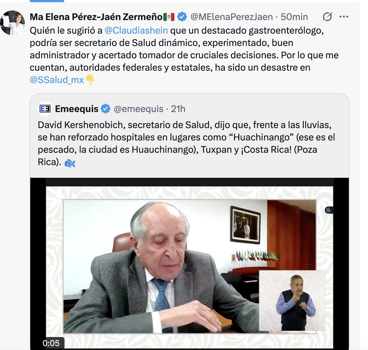 Uno de los comentarios más sobresalientes y críticos, fue el de María Elena Pérez-Jaén Zermeño, exdiputada federal del PAN y excomisionada del IFAI, pues escribió: “Quién le sugirió a @Claudiashein que un destacado gastroenterólogo, podría ser secretario de Salud dinámico, experimentado, buen administrador y acertado tomador de cruciales decisiones. Por lo que me cuentan, autoridades federales y estatales, ha sido un desastre en @SSalud_mx”.