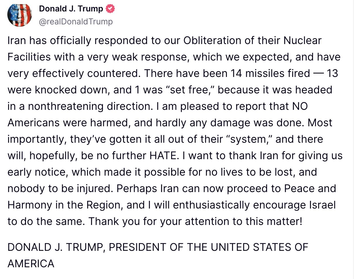 “Irán ha respondido oficialmente a nuestra destrucción de sus instalaciones nucleares con una respuesta muy débil, algo que esperábamos y que hemos contrarrestado con gran eficacia. Se han disparado 14 misiles: 13 fueron derribados y uno fue liberado, ya que se dirigía en una dirección no amenazante. Me complace informar que ningún estadounidense resultó herido y que prácticamente no se produjeron daños”, dijo en Truth Social.