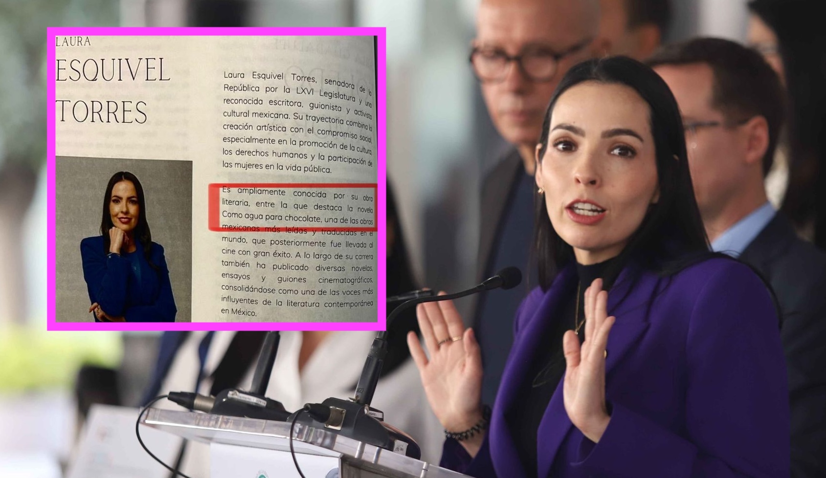 En un libro del Senado, en el apartado biográfico que corresponde a la panista Laura Esquivel Torres, se menciona: “Es ampliamente conocida por su obro literaria, entre la que destaca la novela "Como agua para chocolate".