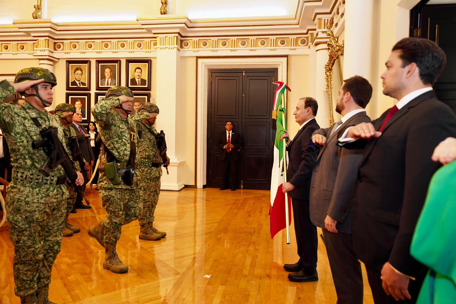 Para iniciar la ceremonia, el jefe del Ejecutivo estatal recibió el lábaro patrio de los elementos del 73 Batallón de Infantería y se trasladó al balcón de Salón Gobernadores para entonar las arengas y evocar el Grito de Independencia al ondear la bandera mexicana.