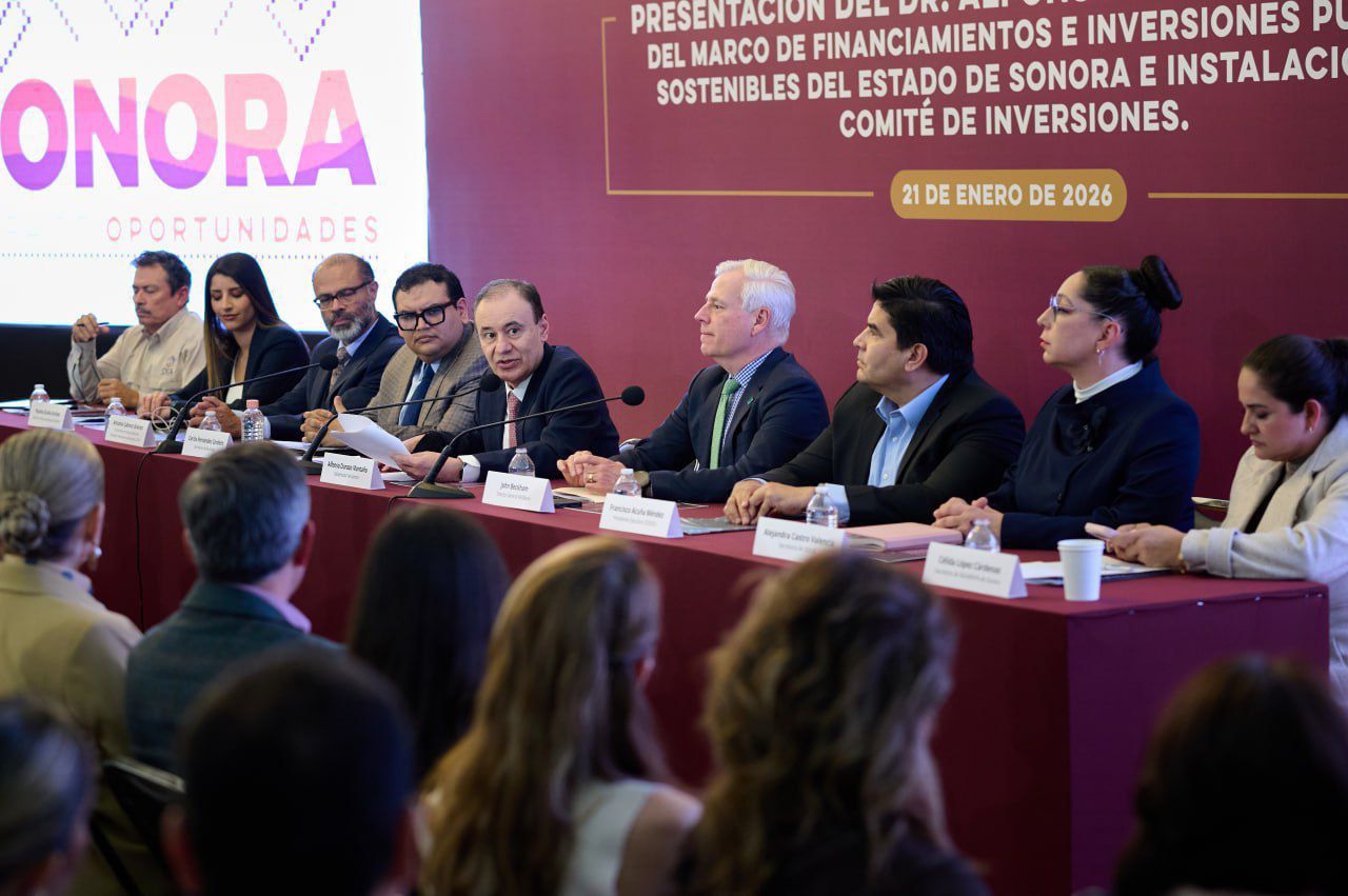 Hermosillo, Sonora; 24 de enero de 2026.- Con una visión de largo plazo y alineada al uso de los recursos públicos con estándares internacionales de sostenibilidad, el gobernador Alfonso Durazo Montaño encabezó la presentación del Marco de Financiamientos e Inversiones Públicas Sostenibles del Estado de Sonora, una estrategia que coloca a la entidad como referente nacional en el acceso a financiamiento verde, social y ambiental bajo estándares internacionales.