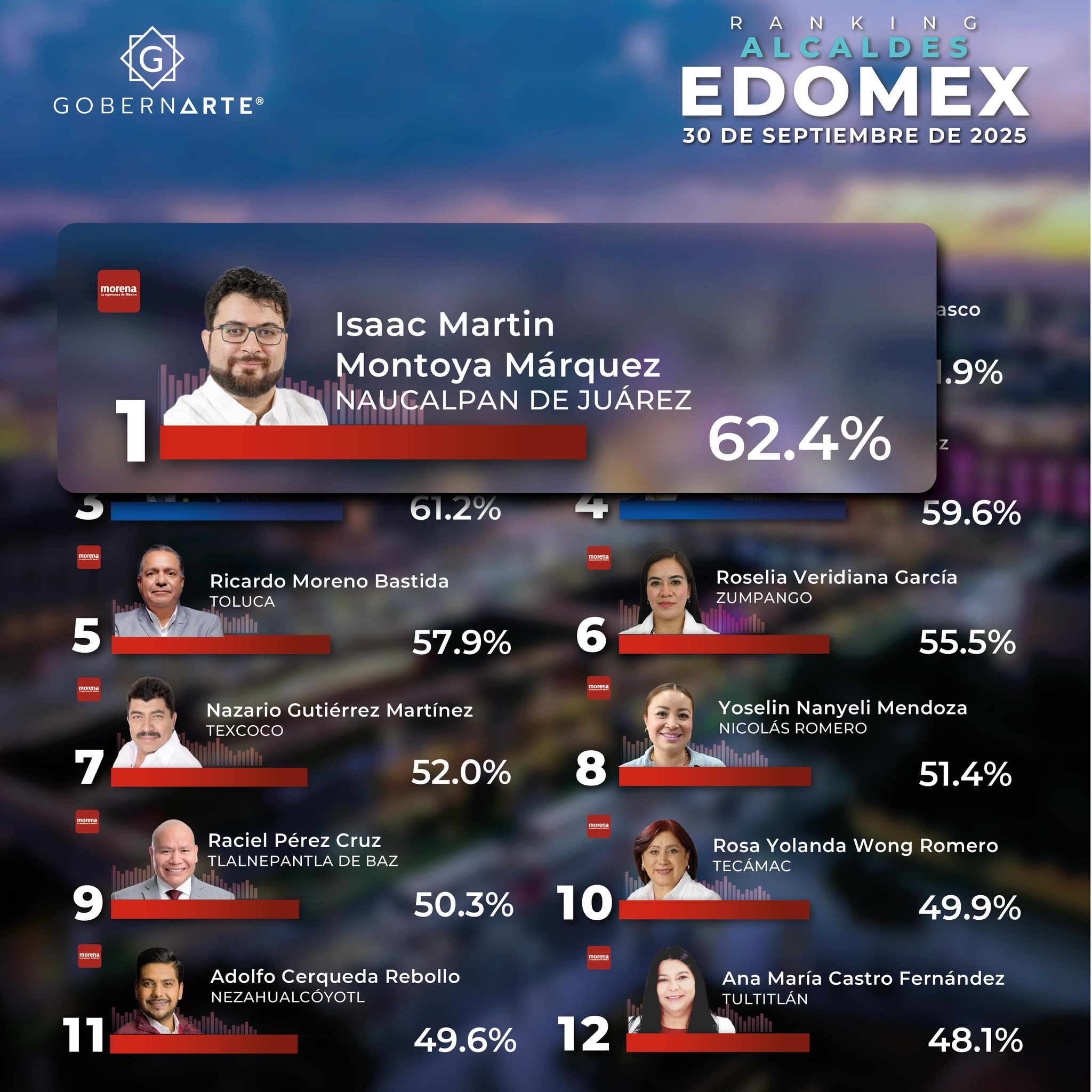 Naucalpan de Juárez, Méx.- El reciente ranking de alcaldes del Estado de México, realizado por la casa encuestadora GobernArte, ubicó al presidente municipal, Isaac Montoya Márquez en el primer lugar con un 62.4% de aprobación gubernamental.