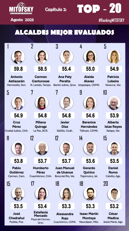 En el top 20 de alcaldes mejor evaluados, Isaac Montoya destaca como el mejor calificado del Estado de México con un índice de aprobación del 53.3%. El presidente municipal de Naucalpan ha escalado más de 120 posiciones en solo seis meses de la posición 139 en febrero hasta la ubicación 18 en agosto.