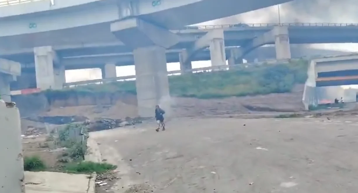 Le explica a la gente que camina junto a él Si tienen lesión, súbanse a la estación. La grabación es improvisada; antes se veía el puente, ahora, se ve el asfalto y los pies. El trabajador recorre varios metros de la vía. Junto a una de las unidades azules del Trolebús, hay una mochila negra tirada.
