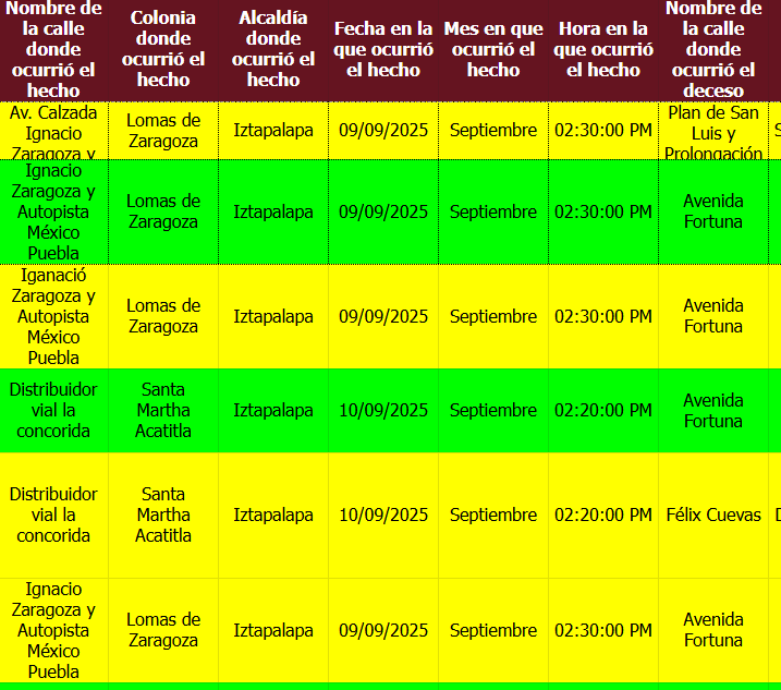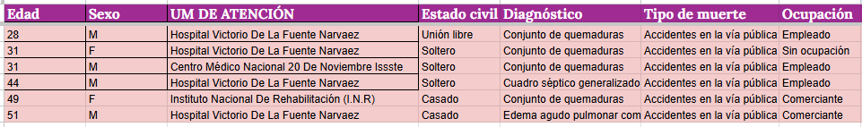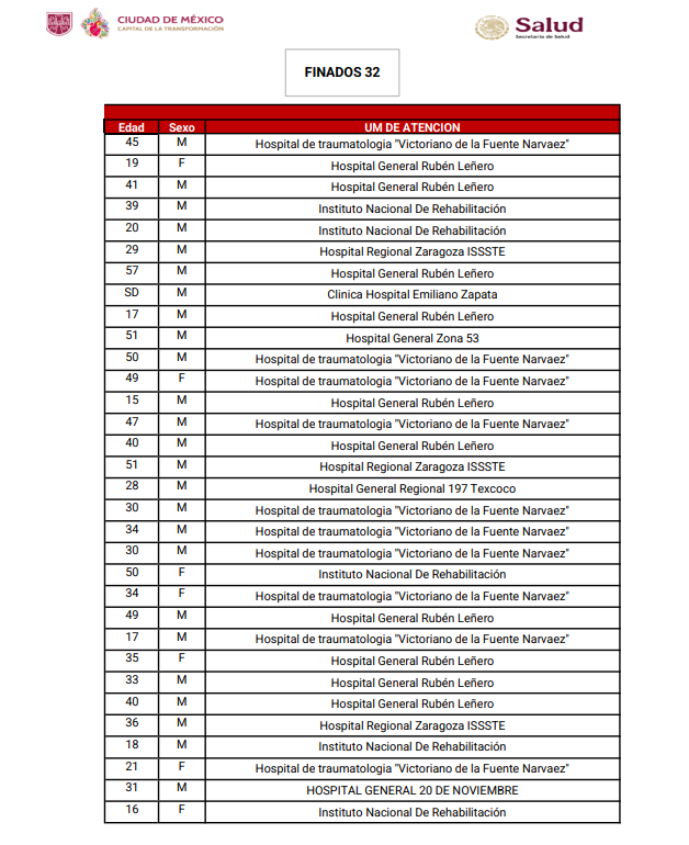 No obstante, instituciones como la Secretaría de Salud y la Fiscalía General de Justicia capitalina enviaron tablas con la información que tenían: las 32 víctimas difundidas a través de diferentes canales del gobierno de la Ciudad de México con datos como edad y hospital en el que ocurrió el deceso.