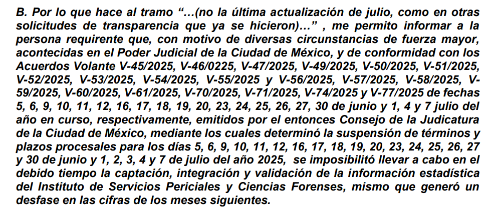 Luego de realizar varias solicitudes de transparencia al Tribunal Superior de Justicia de la Ciudad de México (responsable del INCIFO), la institución se negó a dar la información solicitada, dando como justificación “circunstancias de fuerza mayor” y presentado un Excel con los cuerpos, actualizado hasta julio de 2025.