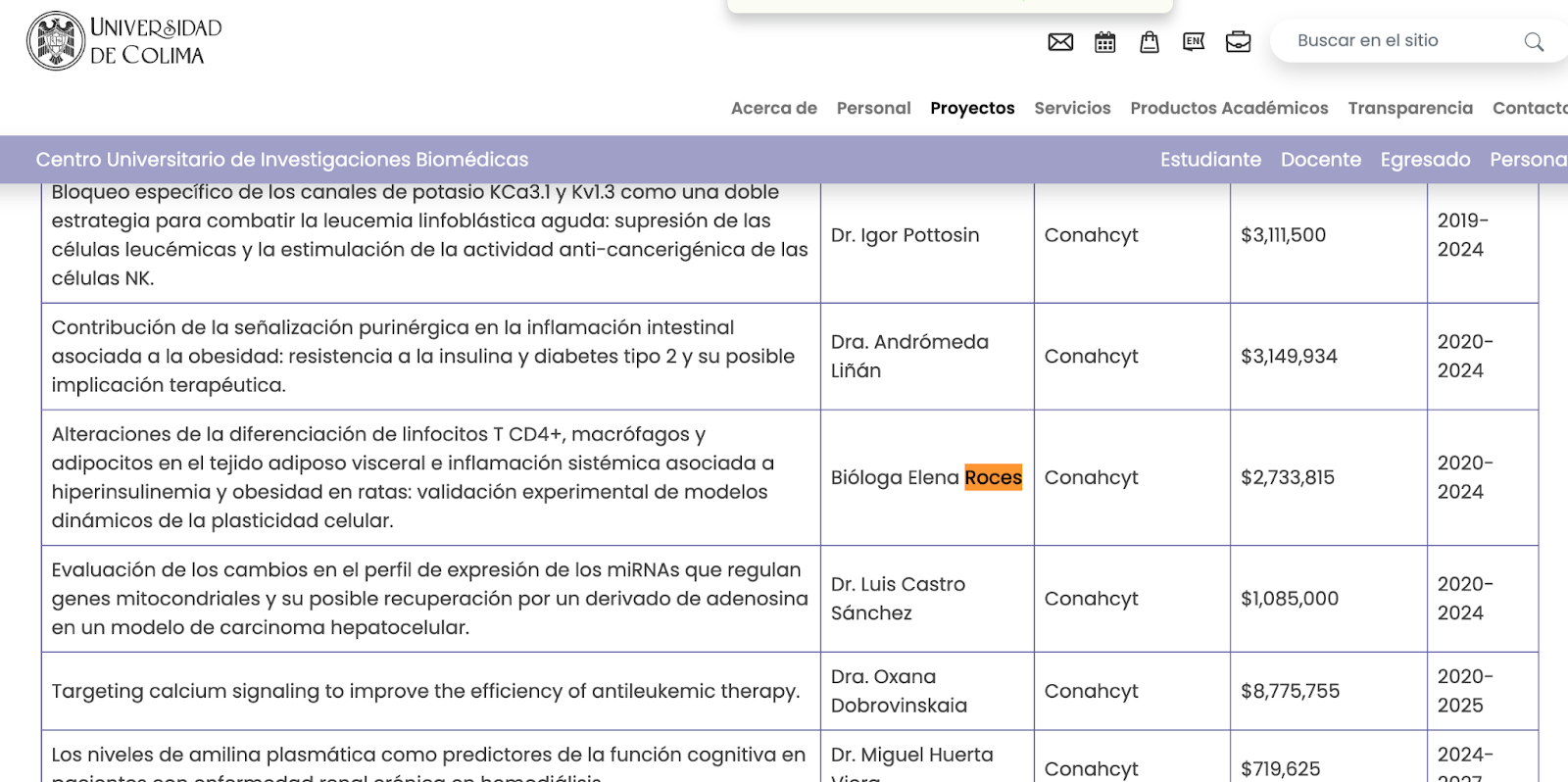 Mientras tanto, el proyecto de Elena Roces, madre de Elena Álvarez Buylla, para la exploración “un área crucial de la patología metabólica: las alteraciones en la diferenciación de células inmunes y adipocitos dentro del tejido graso visceral, y su vínculo con la inflamación sistémica en ratas con hiperinsulinemia y obesidad”, recibió 2 millones 733 mil 518 pesos, también durante el periodo en que Álvarez-Buylla era la titular de la ciencia en México (2021) en el sexenio pasado.