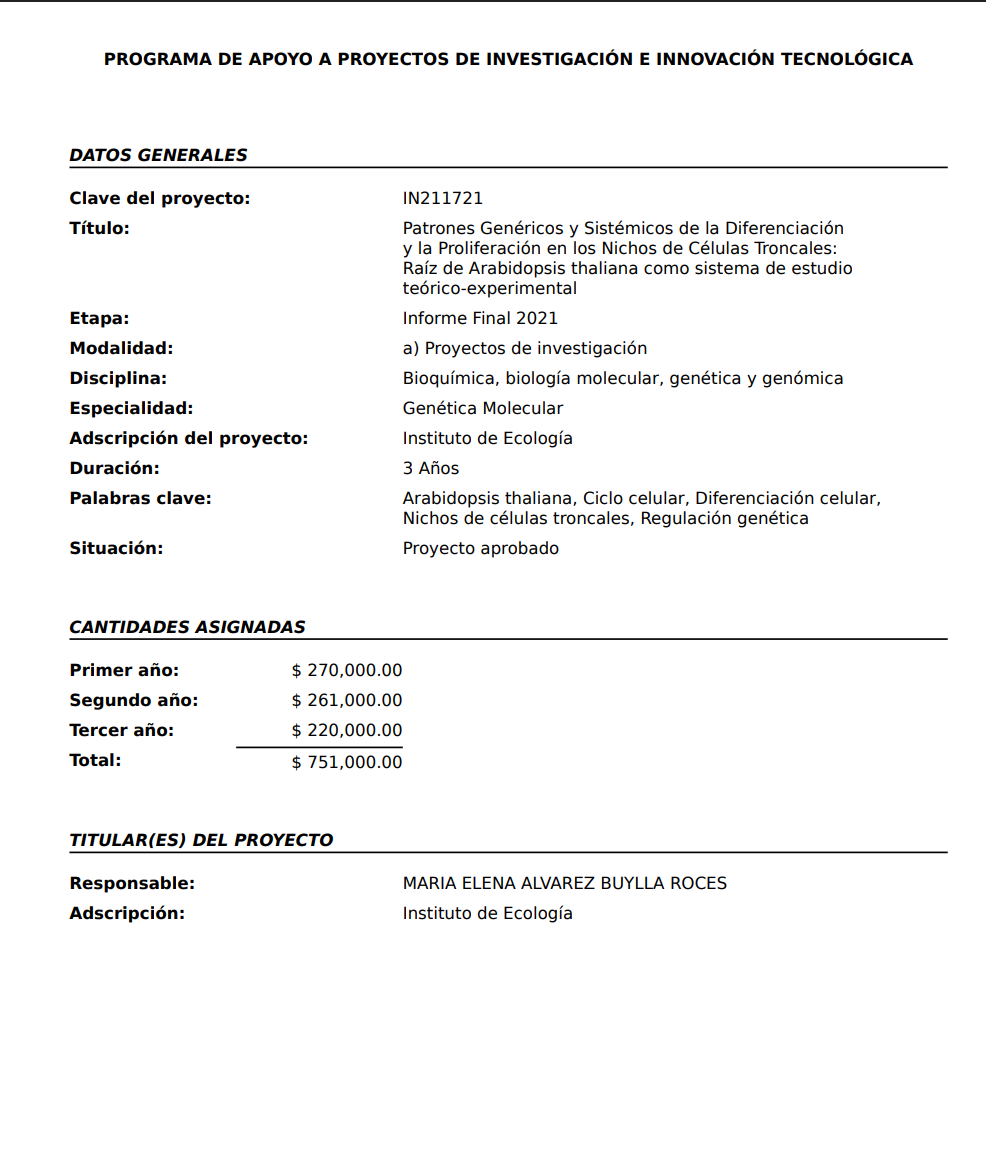 El proyecto de Álvarez-Buylla es un informe técnico que detalla los avances y resultados de investigación en la disciplina de bioquímica, biología molecular, genética y genómica.